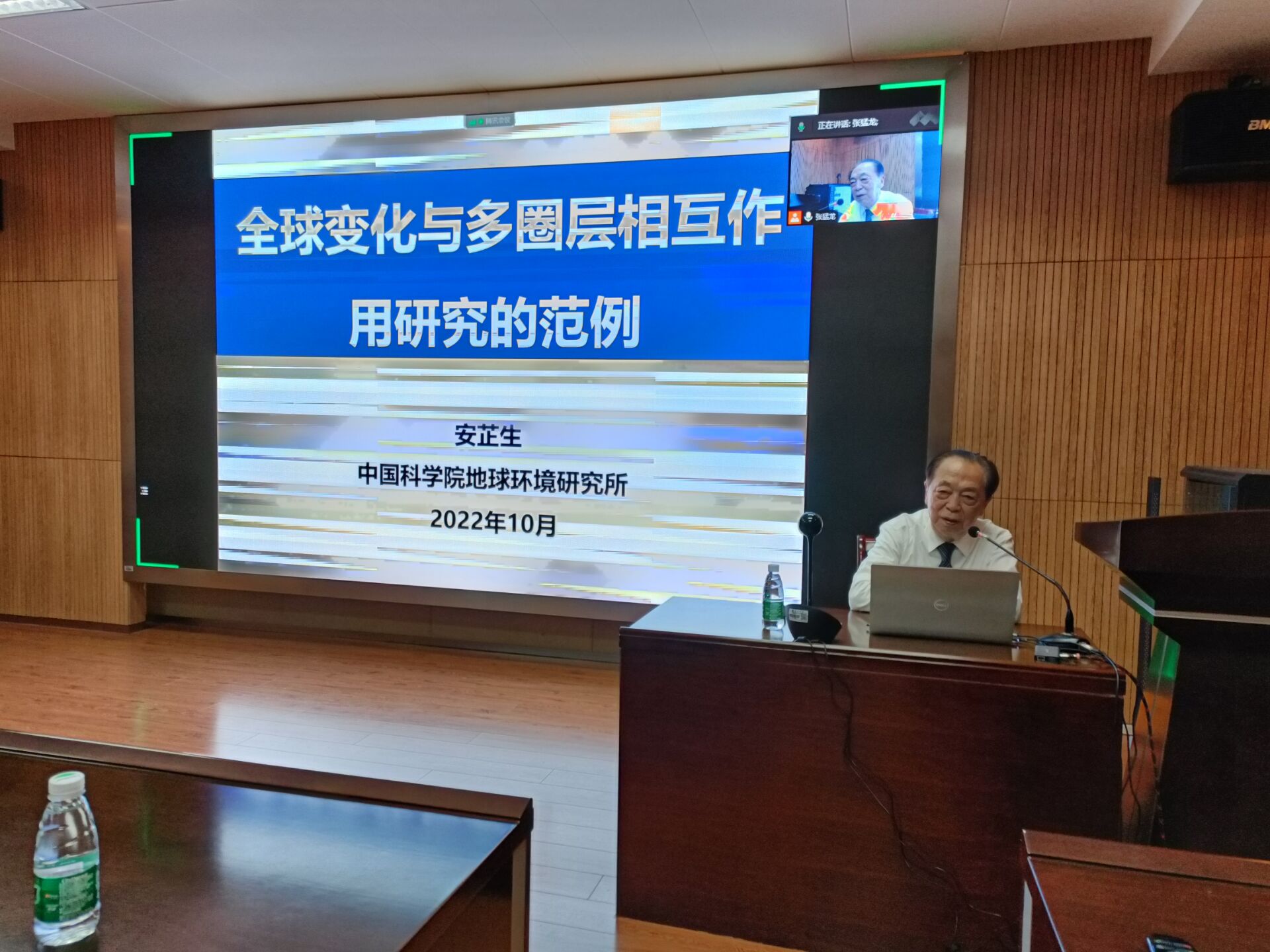 在报告“全球变化与多圈层相互作用研究的范例”中,安院士首先介绍了全球变化问题研究的发展历程,之后分别以“东亚季风与环境变化”、“近800年来中太平洋ENSO演化”,以及“近500年来自然过程与人类活动对黄河径流影响”等研究为案例,说明了地球系统各个圈层如何相互作用影响地球环境。在报告“Chinese Loess: A Key Record of Global Changes”中,安院士讲述了我国黄土研究的历史,论述了东亚黄土沉积作为古气候重建材料的均一性、全球性,并分享了有关黄土研究的新进展。提问环节,线上、线下参加会议的老师、同学们积极与安院士交流听取报告后产生的疑问、思考,安院士亲切地一一回答,现场氛围热烈。