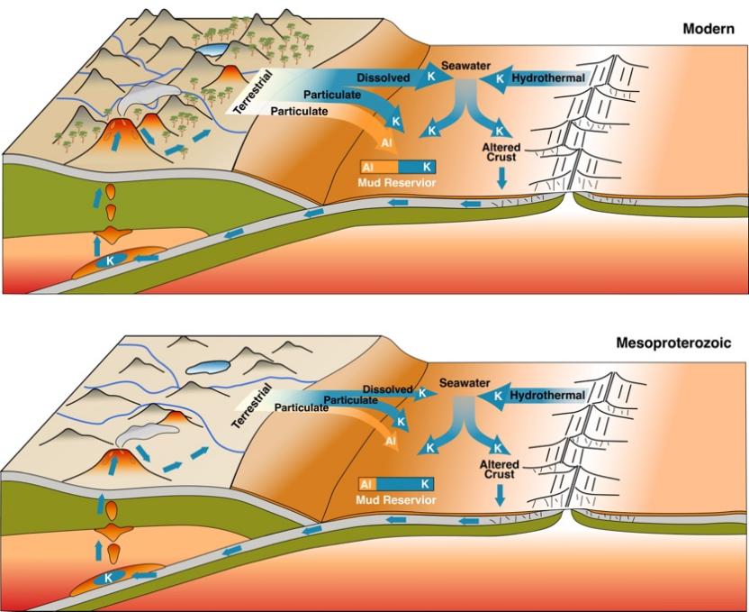 大气氧化是地球宜居性演化的重大事件,深刻影响地球多圈层相互作用。近年来,304永利集团官网入口表生地球化学教育部重点实验室李高军教授团队重点关注大气氧化与大陆风化之间的相互作用。例如,新元古代大气氧化事件可能通过氧化作用,加深风化前锋带,增强风化作用CO2吸收效率,从而引起全球性雪球地球事件(Wei & Li, 2024)。根据风化带氧化推进假说,大陆风化与大气氧化理应存在耦合关系,但缺乏深时大陆风化记录予以支撑。最近,该团队根据元素地球化学循环原理,提出基于页岩K/Al大数据恢复大陆风化的新方法。大陆风化向海洋同时提供K和Al而洋壳风化仅仅提供K(图 1),大陆风化贡献占比越高,海洋页岩沉积K/Al越低。根据近1.8万个页岩数据集成,研究发现在晚新元古代-早古生代之后,大陆风化呈现数量级增长,与大气氧化过程密切相关。研究还认为,大陆风化P输入导致的有机碳埋藏与大气氧化之间存在正反馈作用,进一步促进大陆风化与大气氧化(图2);晚新元古代-早古生代大陆风化增强之后才能形成大量黏土,并深刻影响俯冲过程、造山运动、岩浆作用、金属矿产和油气资源的形成;大陆风化增强有利于岩石K、P等营养元素释放,产生的黏土也有利于陆地水分保持,这些因素可能是植物登陆的前提。