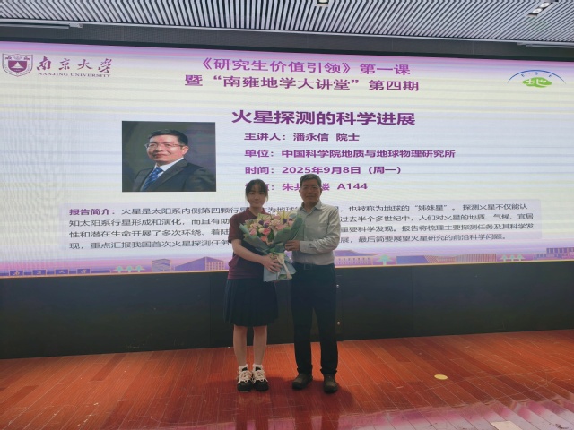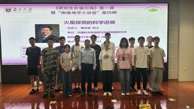 第四期 “南雍地学大讲堂” 报告,以火星探测进展为核心,从人类探测脉络、核心科学问题,到“祝融号”成果与前沿方向,为师生带来了一场精彩的学术盛宴,互动环节亦迸发思想火花。潘永信院士解答疑问时,特别寄语25级新生,希望此次分享成为他们探索行星科学的起点,鼓励其扎实学好数理知识与专业本领,积极投身科研,为祖国深空探测与行星科学注入青春力量。