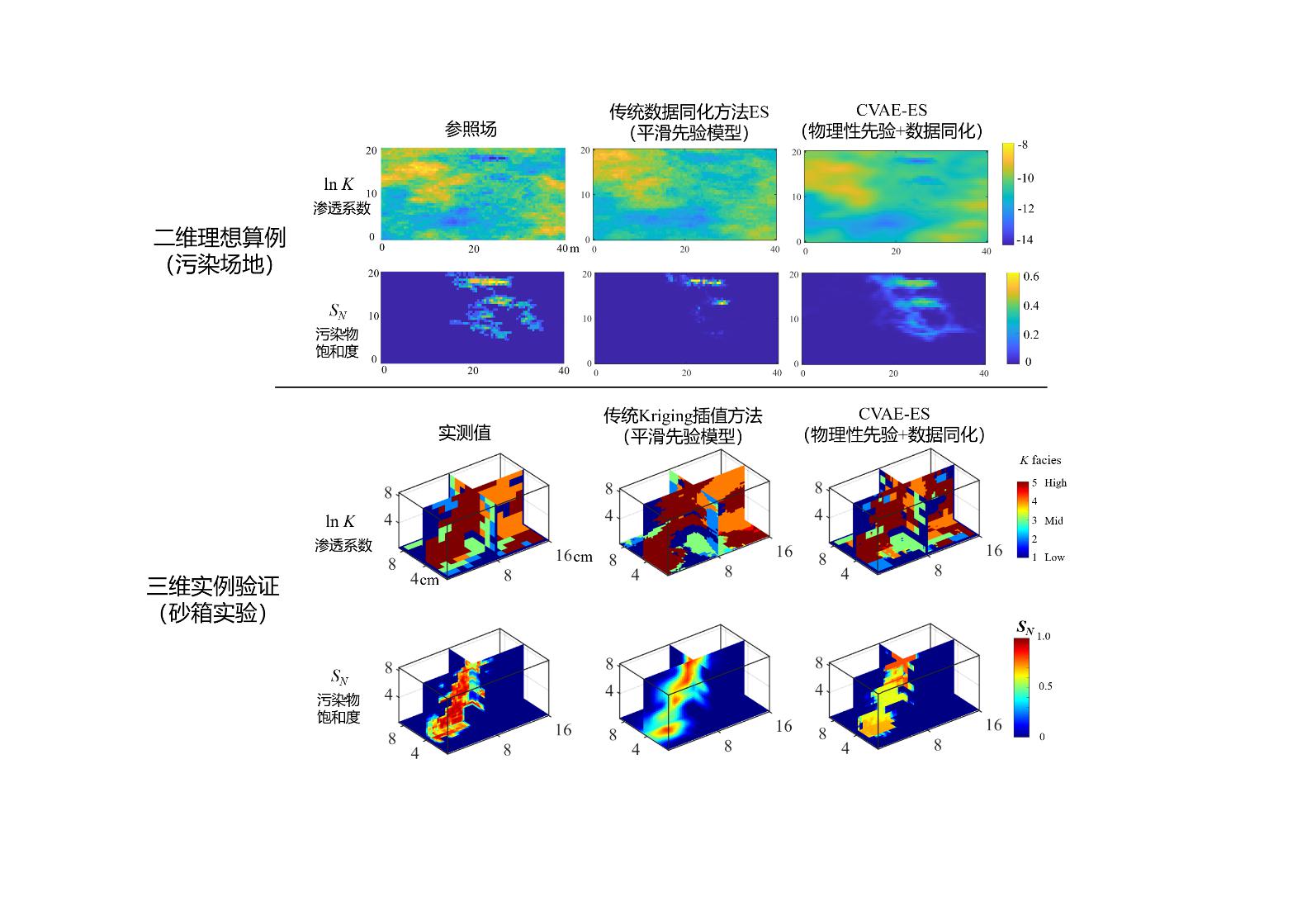 上述成果分别以“Hydrogeophysical Characterization of Nonstationary DNAPL Source Zones by Integrating a Convolutional Variational Autoencoder and Ensemble Smoother”和“Integration of deep learning-based inversion and upscaled mass-transfer model for DNAPL mass-discharge estimation and uncertainty assessment”为题,发表于水文水资源领域权威期刊Water Resources Research。其中前者提出了基于深度学习的DNAPL污染源区刻画方法(CVAE-ES),后者在前者基础上将其与升尺度模型结合以预测污染通量,并基于三维砂箱实验验证了方法的预测效果。