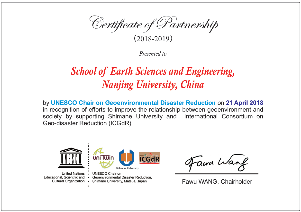 UNITWIN/UNESCO Chair项目旨在建立高校网络和鼓励高校间合作,促进高等教育在研究、培训和课程项目体系等方面的发展,增强国际高校和科研机构的教育和科研能力。目前,该项目在全球117个多家拥有700多个教席。地质环境灾害减灾教席项目(UNESCO-Chair on Geoenvironmental Disaster Reduction)是面向地质环境灾害的UNITWIN/UNESCO教席之一,由日本岛根大学Fawu Wang教授发起,并由联合国教科文组织于2018年2月正式批准成立。该教席致力于促进全球研究机构在地质环境灾害减灾方面的合作与交流。
