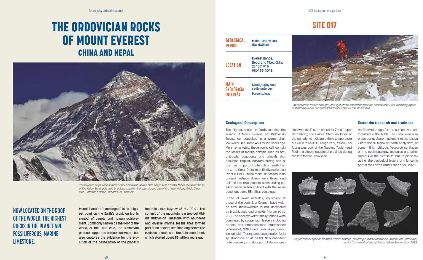 珠穆朗玛峰的山顶是由约4.6亿年前(奥陶纪)的石灰岩构成,形成于温暖的浅水海洋中。这些岩石中含有海洋动物的化石,如腕足动物,牙形类和棘皮动物海百合类,代表地球历史上最重要的时期之一——奥陶纪生物大辐射时期的热带海洋生物,现今大多已经灭绝或很少。这些形成于古特提斯洋的岩石,在印度与亚洲大陆相撞时,被推挤和抬升到现在的位置。