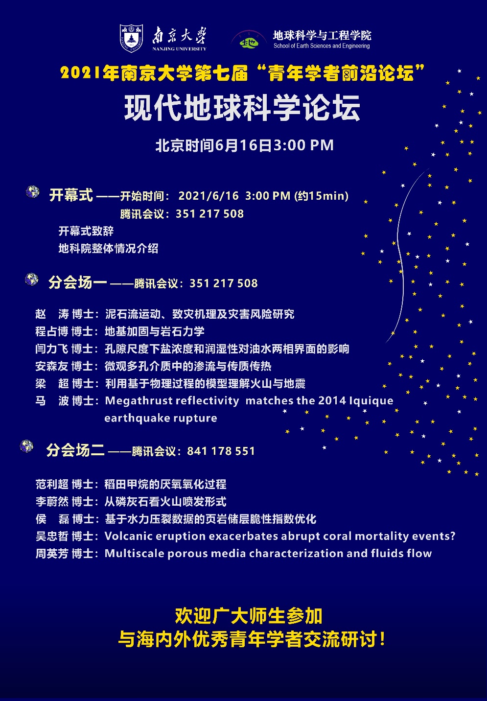 6月16日下午,地科院举办了304永利集团官网入口第七届“青年学者前沿论坛”分论坛——现代地球科学论坛(欧洲专场)。学院党委书记王唯,校学科办主任、表生地化教育部重点实验室主任陆现彩,学院现代地球科学中心青年教师以及师生代表,与来自乌得勒支大学、布鲁内尔大学、华威大学、曼彻斯特大学、剑桥大学、阿伯丁大学、法国Geoazur实验室、德国亥姆霍兹海洋研究所、哥廷根大学、瑞士苏黎世联邦理工等单位的海外青年学者参加了分论坛。
