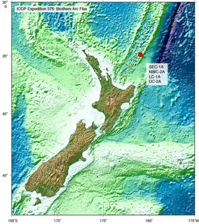 南太平洋,2018年5月9号上午8点,阳光明媚,微风拂面,碧蓝的海水微波荡漾。经过几天在新西兰奥克兰港的准备工作,来自美国、新西兰、英国、德国、加拿大、巴西、日本、韩国和中国的34名国际大洋发现计划(IODP)376次航次的科学家与25名海洋技术专家、48名船员、15名后勤人员一道,搭乘“乔迪斯﹒决心号”钻探船(JOIDES Resolution)来到位于“兄弟火山”(Brothers volcano)火山口上方的预定海域位置,准备在这里打下世界上第一口探究海底弧火山的深钻,并将在接下来的两个月时间里,为揭示这个火山的秘密而共同努力。