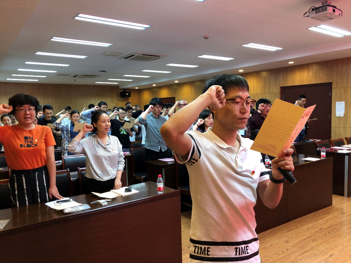 在16级硕士党支部书记徐其良的领誓下,与会党员佩戴党员徽章,庄严地举起右手,面向党旗,共同重温入党誓词,表达了为共产主义事业奋斗终身的理想和信念。