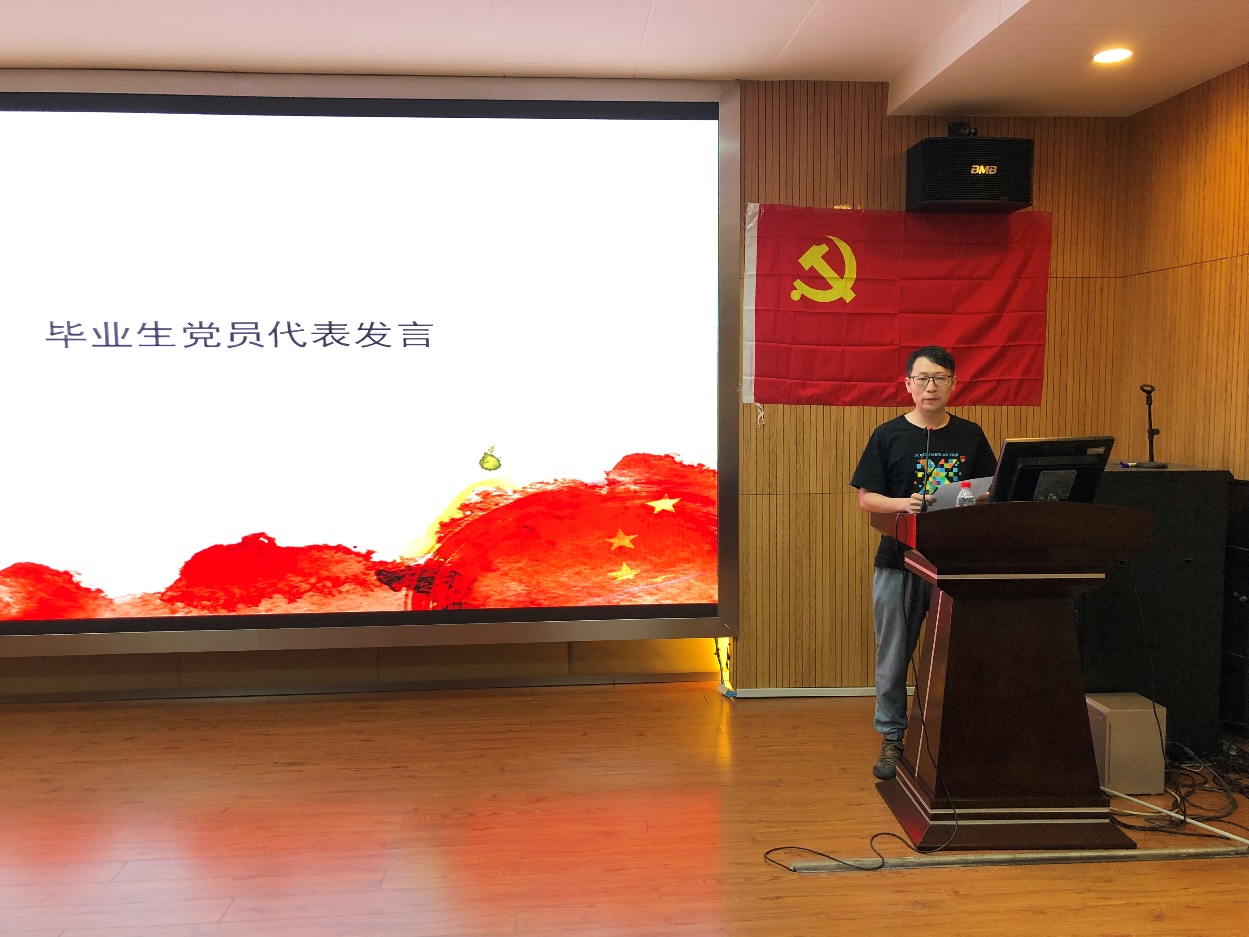 接下来,16级硕士陈光弘作为毕业生党员代表发言。怀着依依惜别之情和对未来的憧憬,陈光弘以习总书记的成长经历为例,呼吁青年党员增强学习紧迫感、能吃苦,在学习中增长知识、锤炼品格,在工作中增长才干、练就本领,注重实干、戒骄戒躁,以真才实学服务人民,以创新创造贡献国家!同时,即将成为一名人民教师的他,也表达了自己想要为国家基础教育贡献出一份南大力量的强烈愿望。