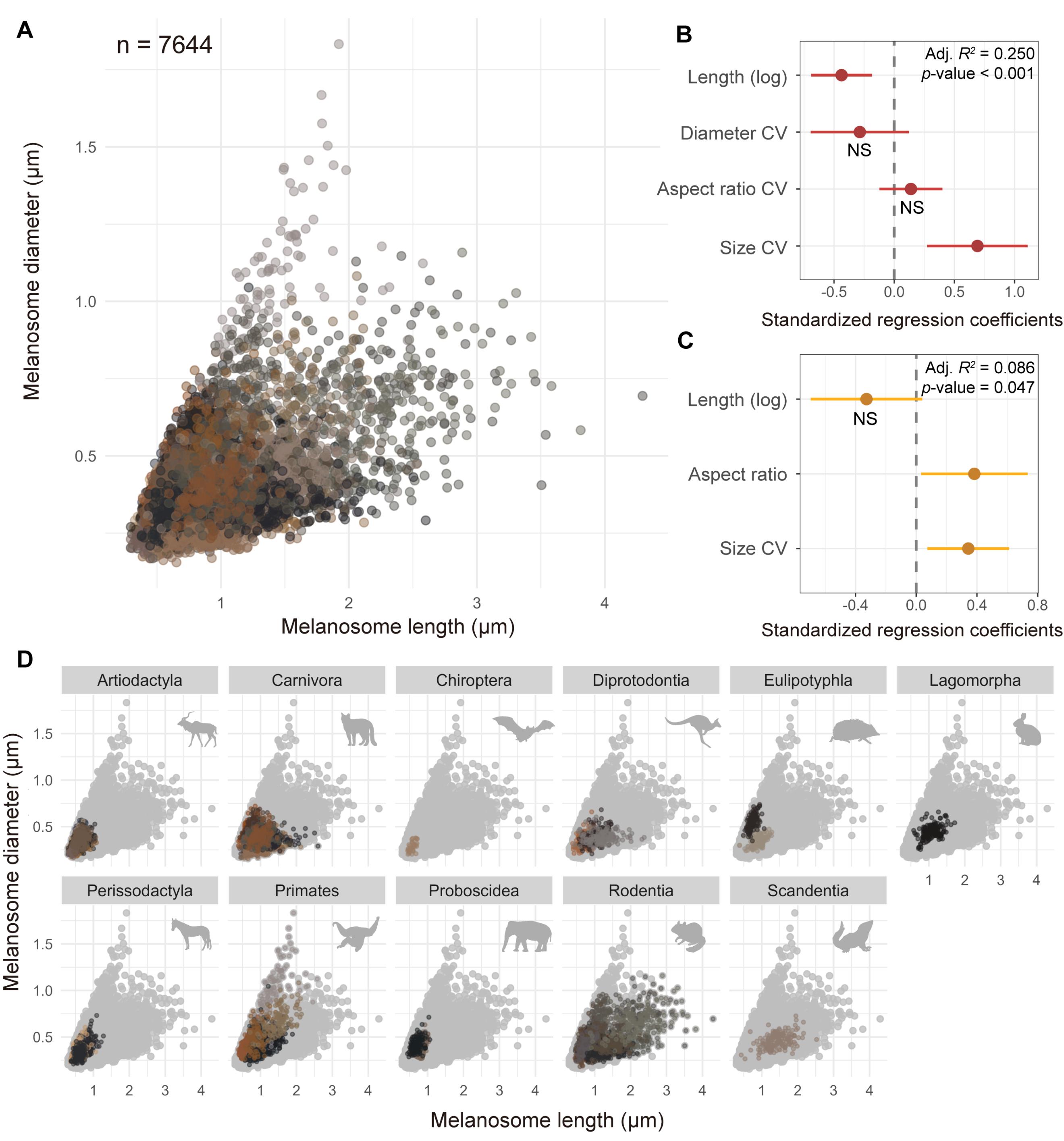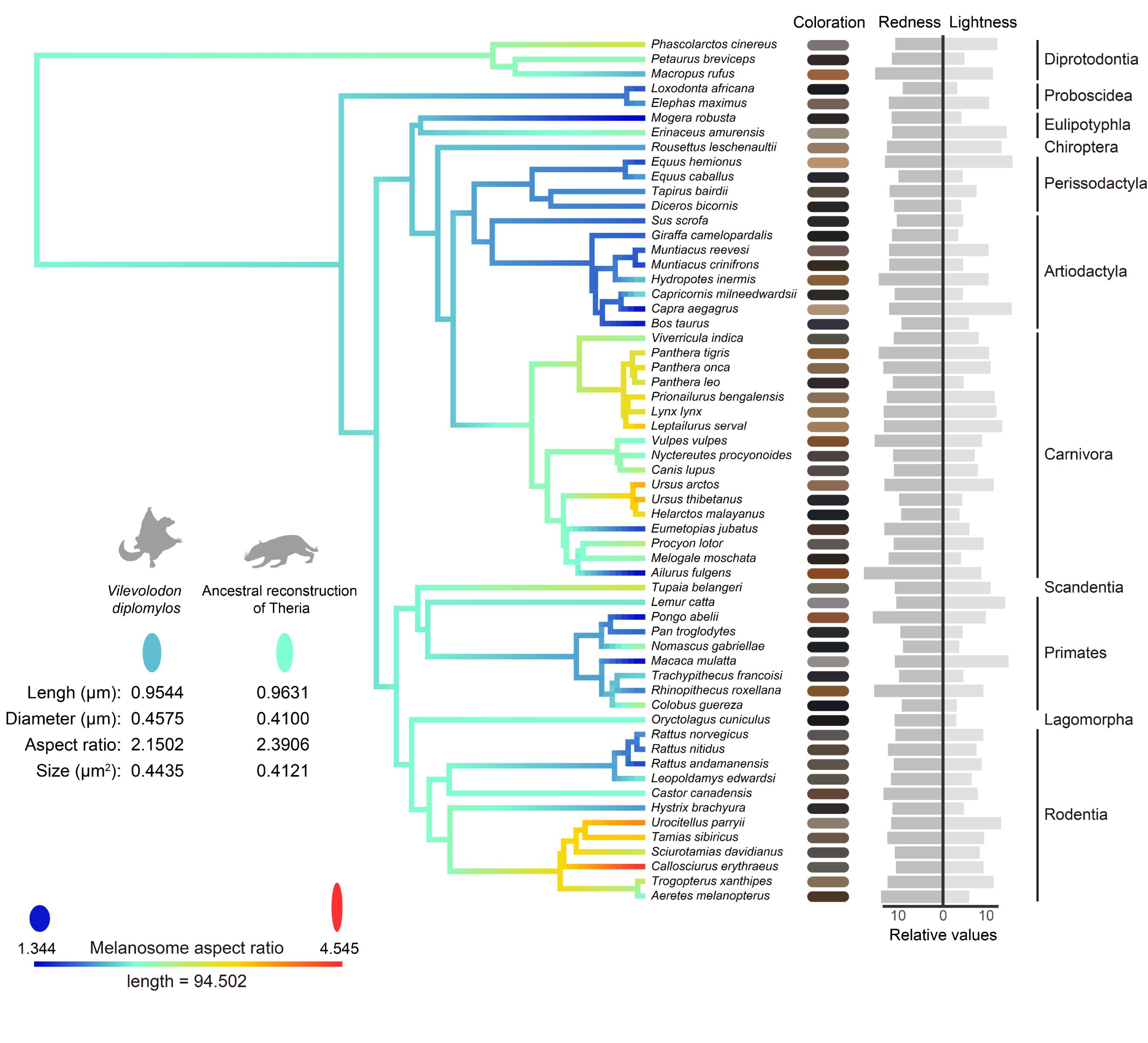 该项研究系统分析了来自11个哺乳动物目、59个现生物种的7000余个毛发黑素体的几何形态,并结合毛色记录、系统发育关系及多个环境变量进行了综合定量评估。结果显示,哺乳动物毛色与其黑素体的几何形态之间仅存在较弱的关联,远不如鸟类羽毛色彩与黑素体形态之间的关系强烈,因此,对于哺乳动物而言,黑素体形态不能作为可靠指标用于化石生物体表色彩重建(图1)。相反,哺乳动物黑素体形态受到系统发育历史的强烈约束:同一目或科内的物种倾向于拥有相似形状的黑素体,即使他们的毛色差异显著(图2)。这说明在哺乳动物中,黑素体形态更多反映的是演化亲缘关系,而并非直接反映色彩功能。此外,研究还发现部分哺乳动物出现了特化的黑素体形态:松鼠科(Sciuridae)与灵长目(Primate)演化出了羊膜动物中罕见的大型黑素体,这类结构在鸟类通常与羽毛的结构性虹彩色(structural iridescence)相关,但在这些哺乳动物中并未伴随类似的结构色表现。