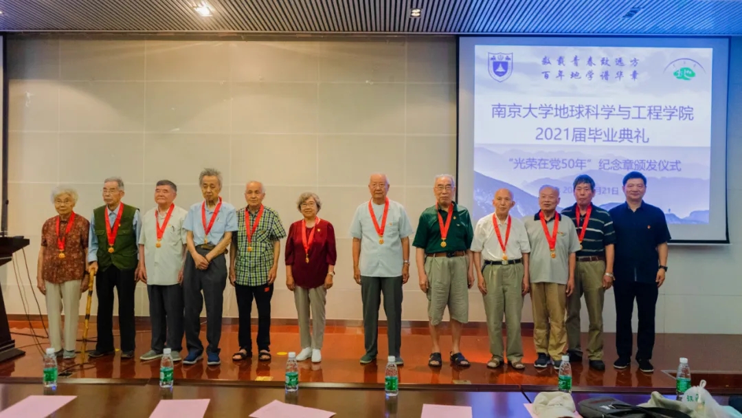 今年是建党百年,也是地质学科成立百年。自建党以来,地质学儿科与中国共产党风雨同舟,不断涌现出一批批优秀党员。在深入开展党史学习教育,喜迎中国共产党成立100周年之际,中共中央首次颁发“光荣在党50年”纪念章,永利集团官网共有21名老党员获此殊荣。6月21日,院党委邀请了其中11位老党员亲临2021届毕业典礼现场,感受新一代地学新人的朝气与活力,举行隆重的“光荣在党50年”纪念章颁发仪式,这既是对老党员同志们过去工作的肯定,也是为年轻党员同志树立标杆榜样。