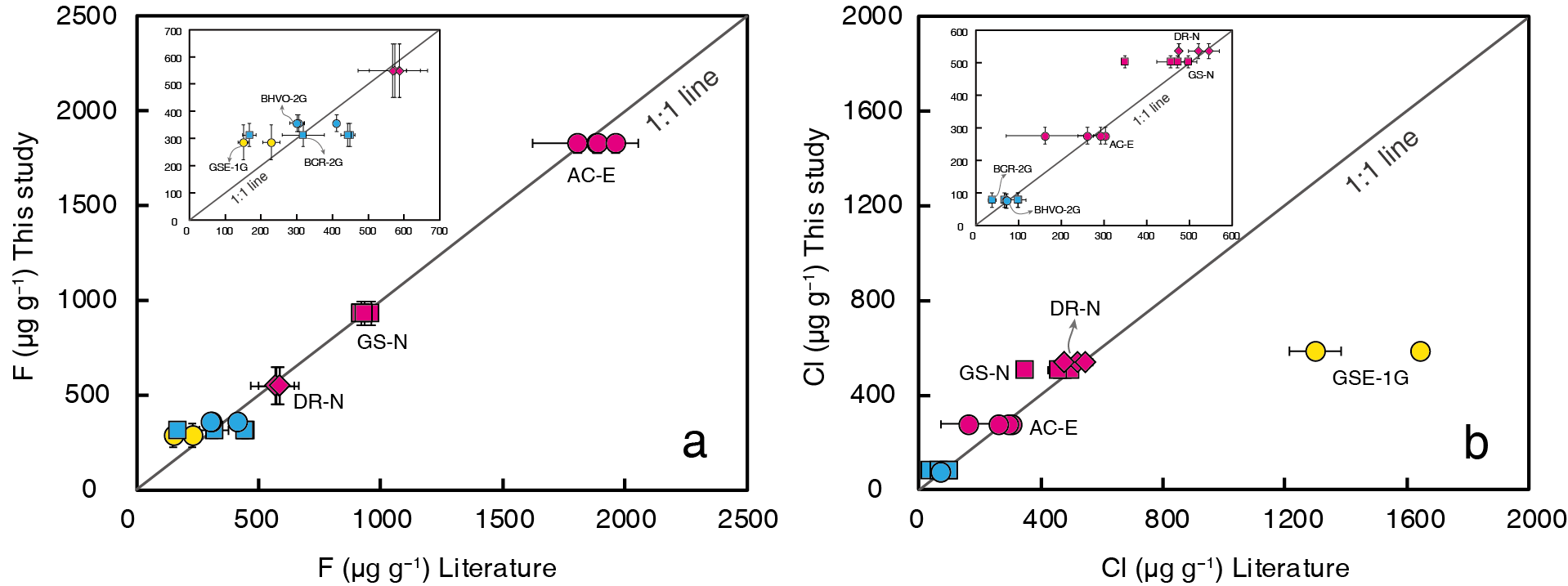 图1:分析的玻璃质标样中F (a)和Cl (b)的含量与前人数据的对比。(a)和(b)中分别插入的是F < 700 μg g−1和Cl < 600 μg g−1的扩展图。图中每个点代表一个与前人数据的对比。