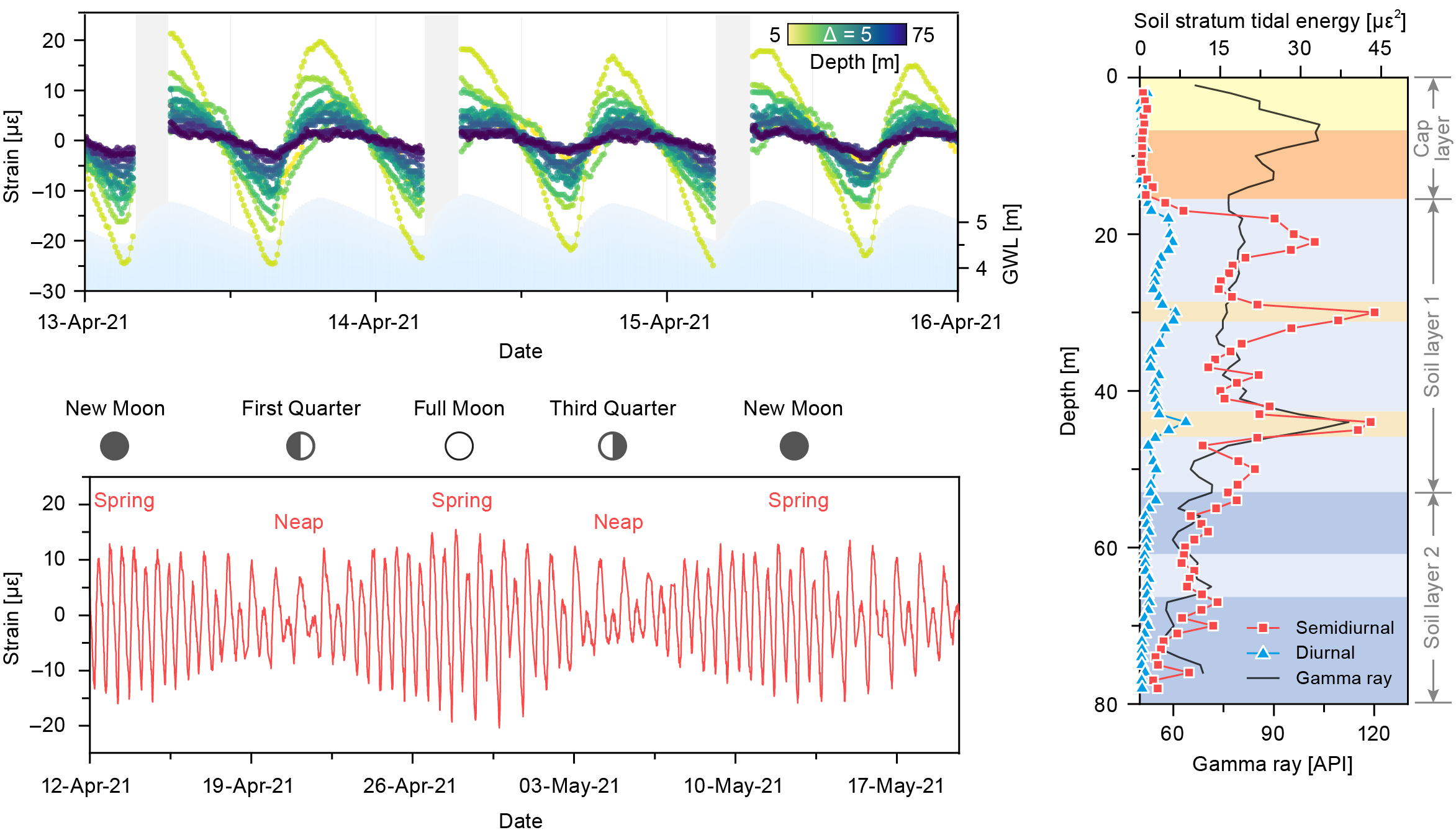 为破解这一谜题,304永利集团官网入口施斌教授带领团队研发出了具有微应变精度的超弱光纤光栅地层形变感知系统,并将该系统安装在长江河口区指南村三个70米的钻孔中(图2),首次观测到了地层形变的半日潮(semidiurnal)和大-小潮(spring–neap cycle)现象,并与张诚成博士和荷兰瓦格宁根大学A. J. F. Hoitink教授通力合作,提出了"土层潮汐"(soil stratum tide)新概念,将其定义为河流潮汐影响范围内由于孔隙水压力波动而引起的土层周期性形变的现象,并揭示了土层潮汐与岩性和深度的依赖关系(图3)。