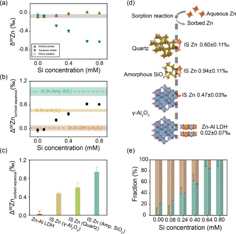 为了解决这一难题,永利集团官网李伟教授团队创新性地利用金属稳定同位素的分馏差异成功示踪了锌离子在不同矿物表面吸附位点的结合模式。与同步辐射研究结果相反,不同表面吸附过程产生的锌同位素平衡分馏却存在较大差异,表面沉淀态的锌可产生0.02 ± 0.07‰的分馏,与氧化铝表面以内圈配位结合态锌可以产生0.47 ± 0.03‰的分馏,与石英和无定型二氧化硅表面结合的锌可分别产生0.60和0.94‰的分馏(图2)。基于同位素平衡分馏的质量守恒原理,我们可以定量算出复合体系各种含锌物种的形态。此前,金属稳定同位素在表生环境领域主要用于宏观尺度的源解析,我们的工作将稳定同位素的应用进一步推广到了微观尺度的地球化学反应过程示踪,为研究复杂系统的元素生物地球化学循环提供新思路。