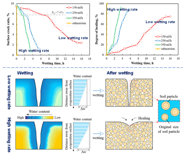 土体裂隙在脱湿过程中萌生并扩展,在增湿过程中会发生愈合。现有研究多侧重于干旱气候作用下的土体干缩开裂行为,然而湿润气候作用下的土体裂隙愈合行为还未受到广泛关注。为此,永利集团官网唐朝生教授课题组围绕该现象开展了一系列土体裂隙愈合试验,重点考虑不同润湿速率的影响。研究发现,窄且短的二级、三级裂隙会首先愈合,宽且长的一级裂隙随后愈合。土体膨胀和崩解作用是土体裂隙愈合的主要原因。随润湿速率增加,土体裂隙愈合程度增大,这主要和不同润湿速率下内外部土体之间形成的含水率梯度有关。低润湿速率下,水分有充足的时间迁移,土体内外形成的含水率梯度小,土体主要发生膨胀,土体裂隙愈合程度低,而在高润湿速率下,土体内外形成的含水率梯度大,当含水率梯度达到一定程度时,土体发生崩解,此时裂隙愈合是由土体膨胀和崩解共同导致的,土体裂隙愈合程度高。该研究有助于理解极端干/湿气候交替作用下土体裂隙张合演化的全周期行为。