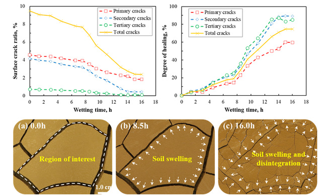 上述研究成果近期以“Healing behaviour of desiccation cracks in a clayey soil subjected to different wetting rates”为题,发表于工程地质领域顶级期刊Engineering Geology,永利集团官网博士研究生田本刚为论文第一作者,程青副教授和唐朝生教授为论文共同通讯作者。研究工作得到了国家自然科学基金、国家重点研发计划课题、江苏省自然科学基金的联合资助。