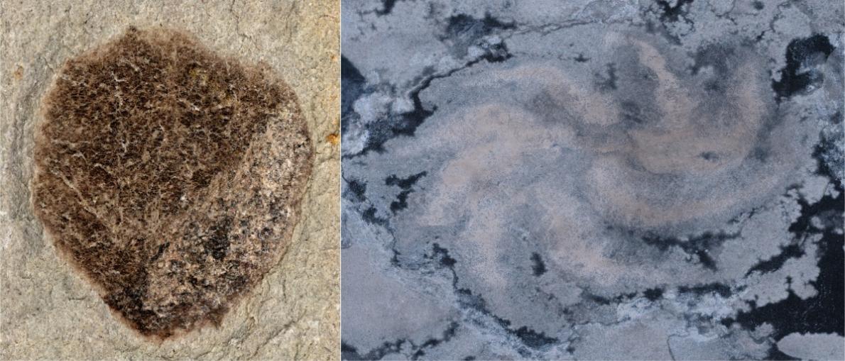 左图:与Bradgatia相对比的叶状形态类动物 (rangeomorph);右图,八臂仙母虫(Eoandromeda octobrachiata)