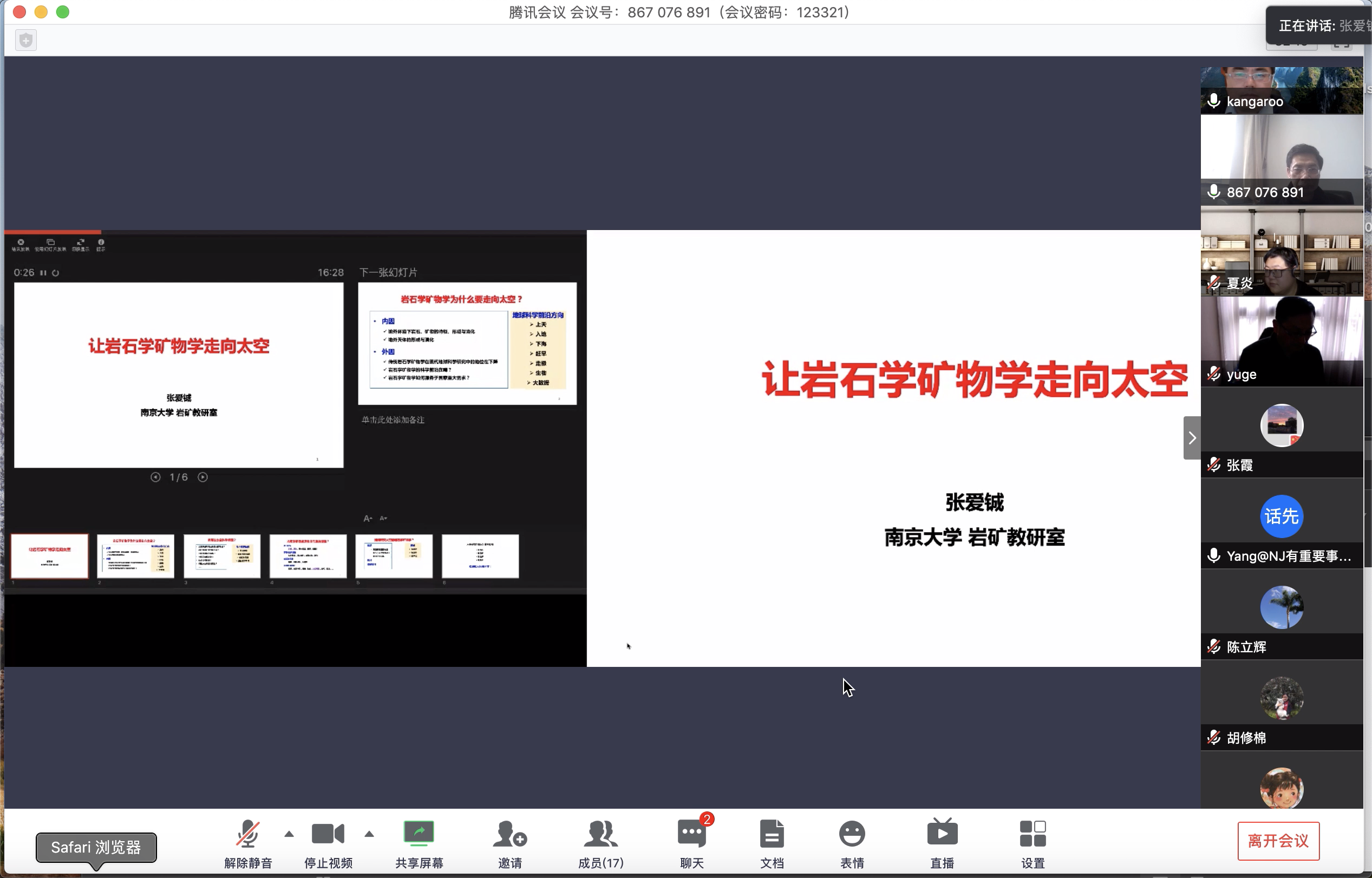 304永利集团官网入口第十一次党代会为建设“第一个南大”、推进“双一流建设”指明了方向、明确了目标。为推动党代会精神全面落实,进一步增强广大教师党员在“双一流”建设中的自觉性和责任感,304永利集团官网入口岩矿教师支部积极响应学校号召,于3月25日下午通过腾讯会议开展了一次别具深意的“线上组织生活”。