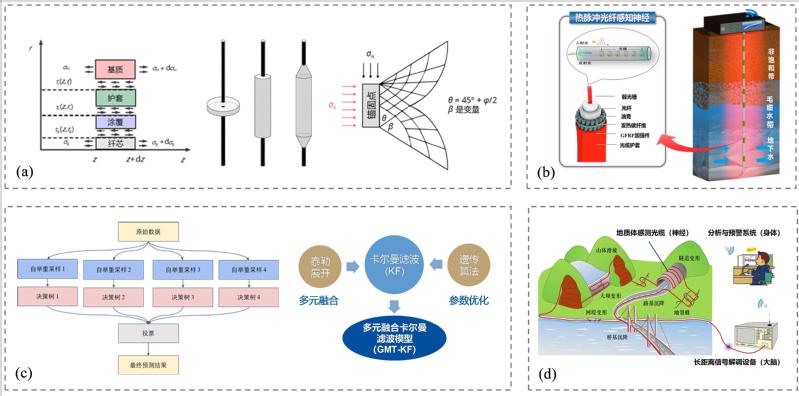 (a) 岩土应变感知耦合理论; (b) 岩土水分与渗流感知方法; (c) 岩土灾变事件识别与预测模型; (d) 光纤感知技术体系