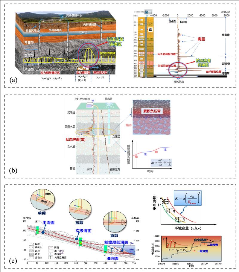 论文重点介绍了相关成果应用于采场覆岩物质界面感知、地面沉降状态界面感知和库区边坡灾变运动界面感知的三个典型案例(图4), 并展示了新的科学发现和认识。 论文的最后指出了岩土体灾变光纤感知技术今后的发展方向和前沿研究课题。