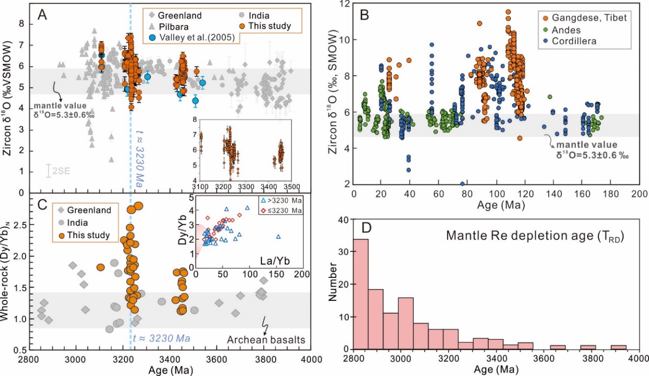 研究团队对于南非Barberton地区的TTG岩石,进行了锆石矿物的离子探针U-Pb定年,确定这些花岗质岩石主要形成于3460–3420 Ma和3205–3265 Ma两个阶段(Ma“百万年前”)。更进一步,研究者选择U-Pb体系封闭的锆石颗粒,进行离子探针原位氧同位素分析,发现大约以3230 Ma为界,该区TTG岩石中的锆石氧同位素组成(表示为δ18O值)发生了一次突变——该区>3230 Ma的TTG岩石中的锆石δ18O值都在地幔值的范围(5.3±0.6 ‰)内,平均值分布在5.07–6.02 ‰之间,而≤3230 Ma的TTG岩石中的锆石δ18O值基本在6 ‰以上,在5.95–7.08 ‰之间,甚至个别分析点的值接近8‰。研究者使用锆石激光拉曼光谱分析和累积辐射计算,认为这些氧同位素分析结果基本没有受到锆石放射性衰变的影响。因此可以相信,这种氧同位素变化是可靠的。