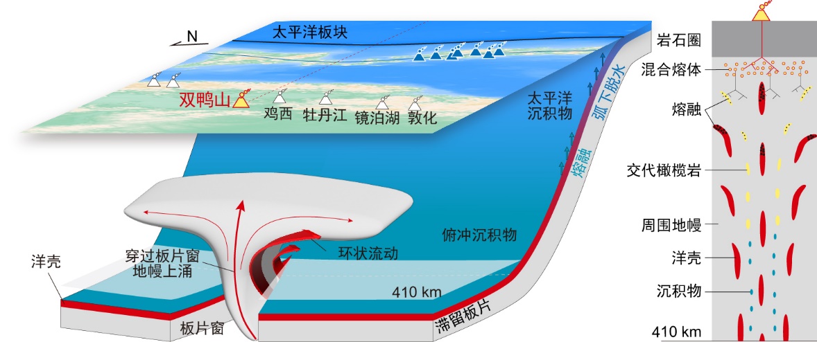 研究结果显示双鸭山玄武岩在稳定同位素组成上具有显著偏高的δ57Fe和偏低的δ26Mg值以及独特的放射成因Pb-Nd同位素组成(图2),在元素组成上则具有偏高的Gd/Yb比值和偏低的Ti/Eu,CaO/Al2O3比值。这些地球化学指标表明双鸭山玄武岩的上地幔源区存在再循环的俯冲太平洋洋壳组分——榴辉岩。与此同时,近震S波分裂分析结果揭示出一个与板片窗相关的上地幔环状流,表明含有板片碎片的地幔上涌流在上地幔中转变为向周围地区的环状流动,从而引发周围地区广泛的板内岩浆作用。初步的地球化学和地球物理检验表明,东亚地区的大多数新生代玄武岩可能与滞留板片在地幔过渡带中的撕裂过程有关。这项研究为大陆玄武岩的起源机制提出了一个“滞留板片撕裂诱发地幔上涌”的地球动力学模型,即俯冲过程引起滞留板片发生撕裂,诱发地幔上涌。该过程导致俯冲到地幔过渡带的洋壳(榴辉岩)随地幔上涌流返回上地幔并减压熔融,从而在大陆内部引发火山作用(图3)。