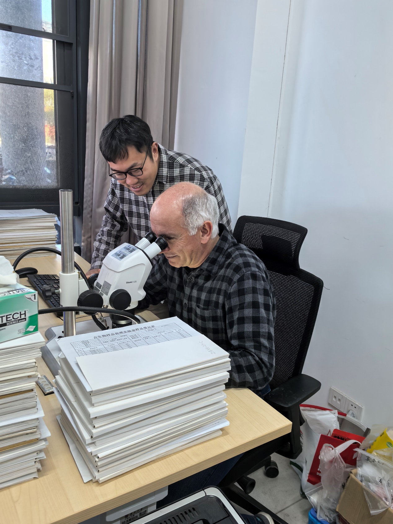 Ramezani研究员与博士生侯章帅在显微镜下共同研判锆石样品,深入探讨实验细节。
