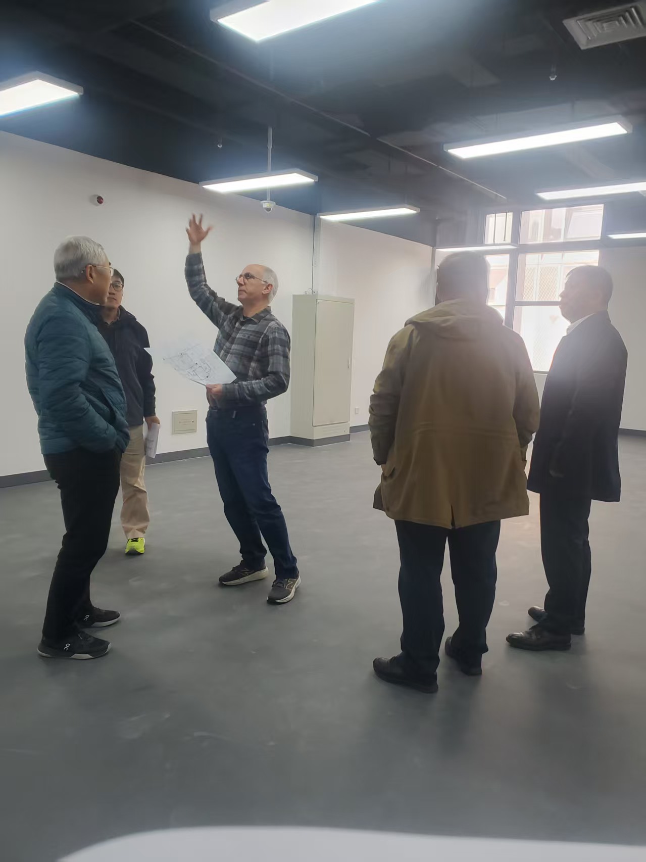 Ramezani研究员、沈树忠院士、侯章帅与超净实验室建设团队在现场讨论实验室设计图纸及建设细节。