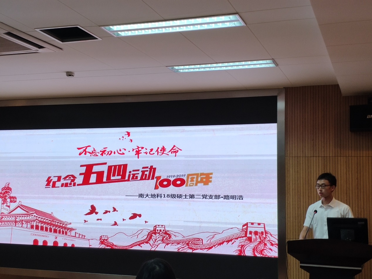 第六位演讲者是来自2018级硕士生二支部的路明浩同学,他的微党课主题是“纪念五四运动100周年”。他以五四运动为背景谈论如何在新时代背景下弘扬五四精神,并以南大校友袁辉为实例讲述了如何实现“建设第一个南大”的目标。