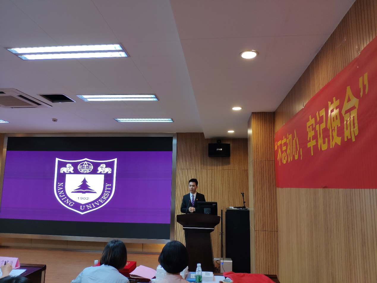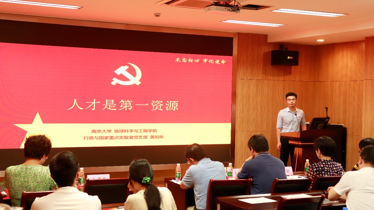 第四位演讲者是来自行政与国家重点实验室支部的黄旭栋老师,他的微党课主题是“人才是第一资源”。他从“历史的经验”——古人重贤、求贤、用贤;“时代的召唤”——习近平总书记提出的“人才资源是第一资源”;以及“我们的努力”——努力建设“第一个南大”三方面阐述了习近平总书记“人才资源是第一资源”的战略思想。