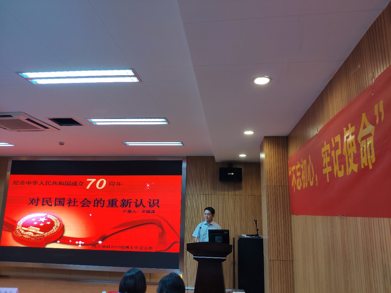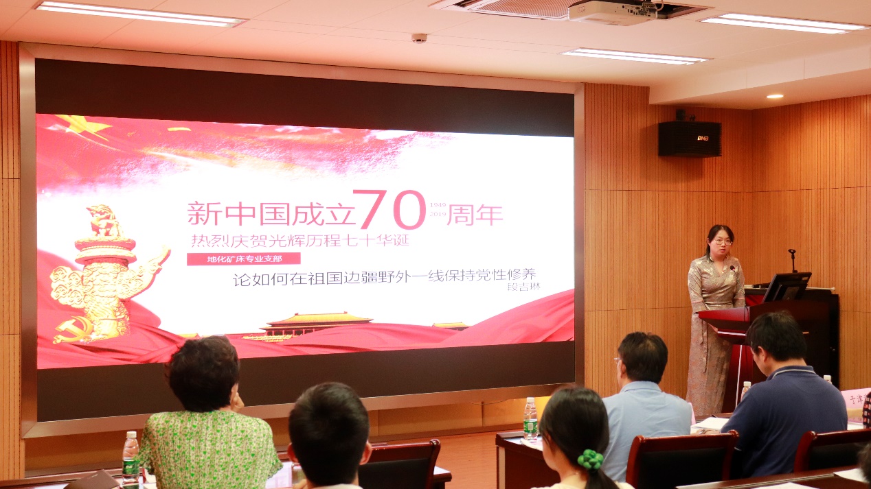 第二位演讲者是来自地化矿床专业支部的段吉琳老师,她的微党课主题是“纪念新中国成立七十周年”。她以“论如何在祖国边疆野外一线保持党性修养”为标题告诫同学们,即使条件非常艰苦,我们也要学习前辈们建设过程中的艰苦奋斗精神,在艰苦的野外能够坚持开展工作,并学会苦中作乐。
