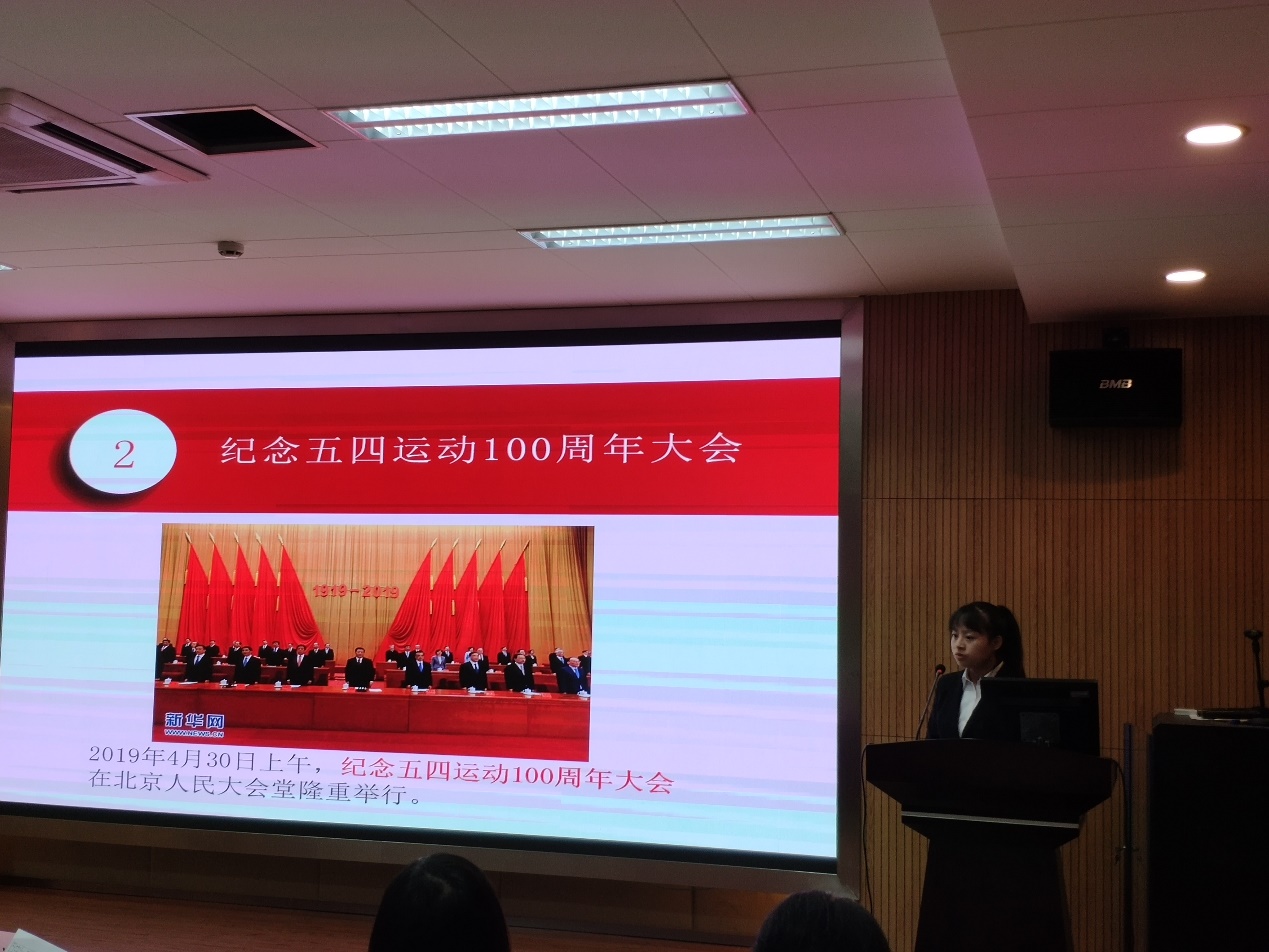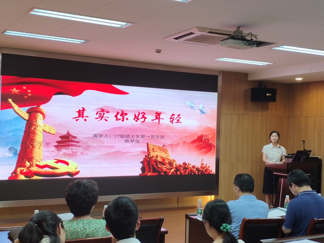 第一位演讲者是来自2017级硕士生一支部的陈梦佳同学,她的微党课主题是“五四精神”。她以“其实你好年轻”的标题引出身为青年人,要有社会敏感度和责任感。100年前,中国青年在国家危难之际挺身而出、奋起反抗;100年后,我们青年要继承这种精神,以天下为己任。