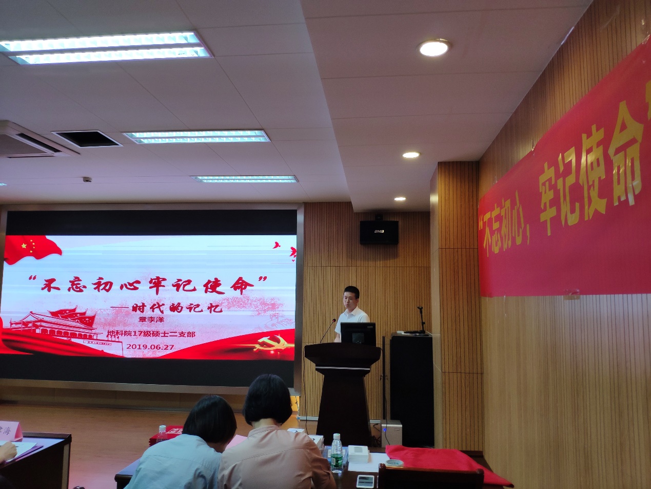 第七个演讲者是2017级硕士生一支部的罗冉同学,她的微党课主题是“不忘初心,牢记使命”。她通过介绍新时代下的新形势新背景,阐释“不忘初心,牢记使命”对共产党员的必要性;通过介绍共产党员的初心和使命,让党员同志更加理解其基本内燃;通过阐述初心和使命是共产党员的力量之源,进一步明确初心和使命的意义;最后,针对青年党员如何践行“不忘初心,牢记使命”提出个人建议。