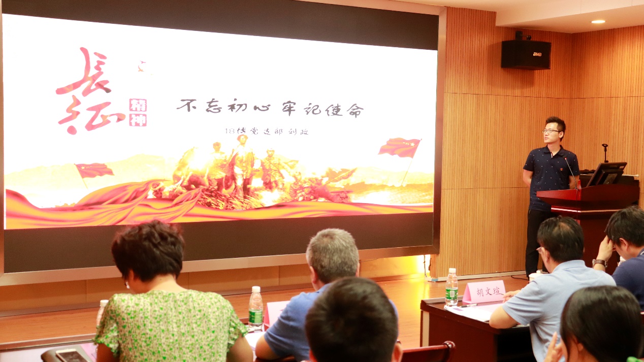 第五位演讲者是来自2018级博士生支部的刘政同学,他的微党课主题是“不忘初心,励志前行”。他告诫大家要牢记“长征精神”体现出的艰苦奋斗,乐观进取,豪迈壮志,脚踏实地、不忘初心的精神,也以“今日长缨在手,何时缚住苍龙?”的提问提出对南大青年的期许。