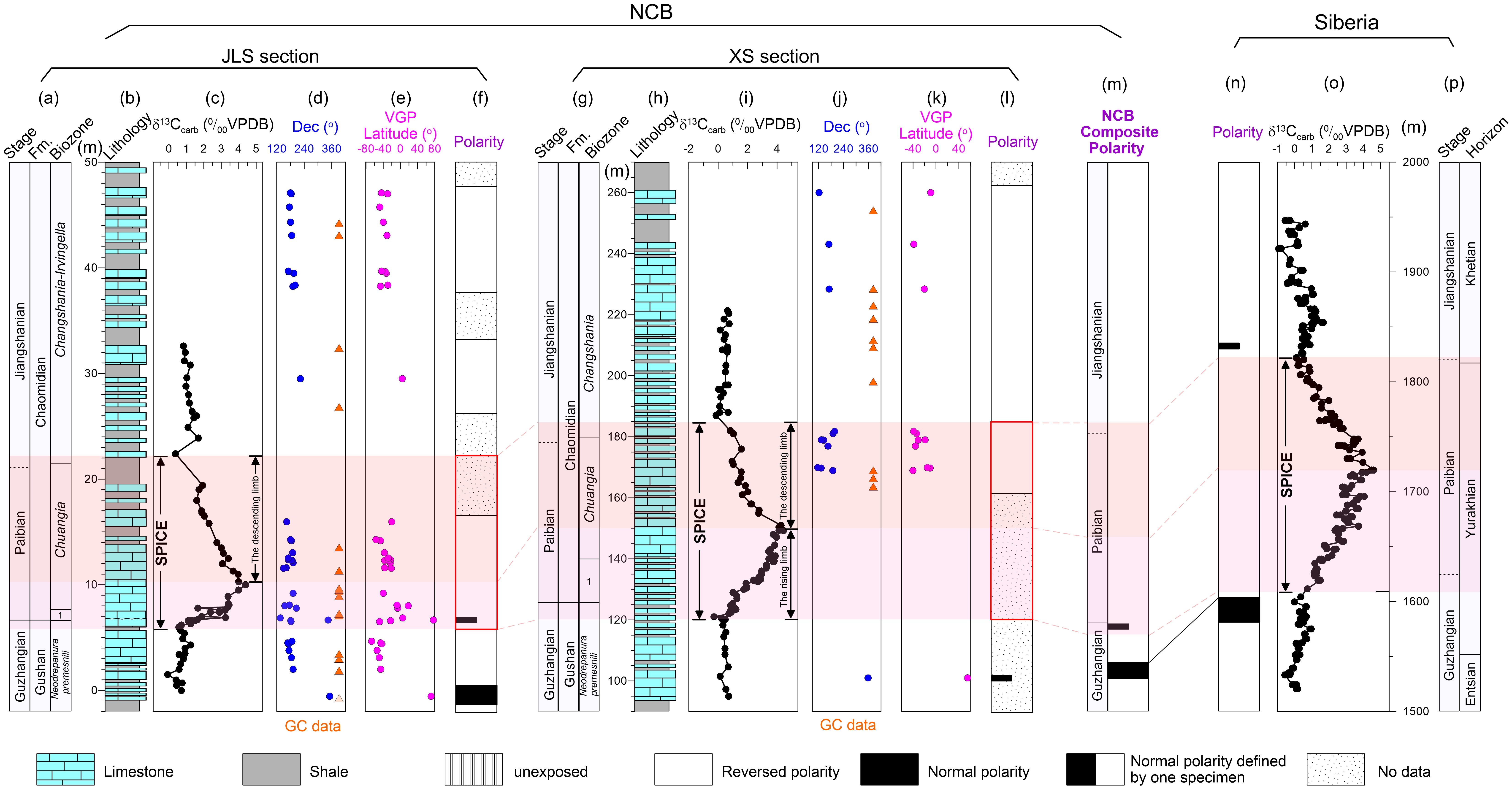SPICE事件是发生于晚寒世期间的全球性重大古海洋与古气候事件,对全球碳循环产生了强烈扰动,在地质记录中表现为全球可对比的、特征的碳同位素正偏移。同时,SPICE事件还伴随着特定种属的三叶虫灭绝。基于前人对山东九龙山剖面和辽宁西山剖面已开展的三叶虫古生物和碳同位素地球化学研究结果,厘定了两个剖面上SPICE事件的起止层位,并开展了高分辨磁性地层研究。