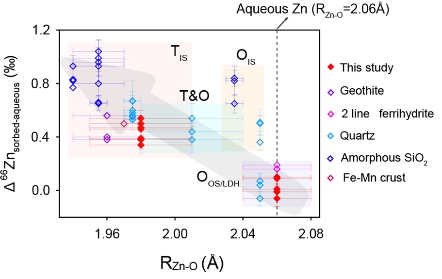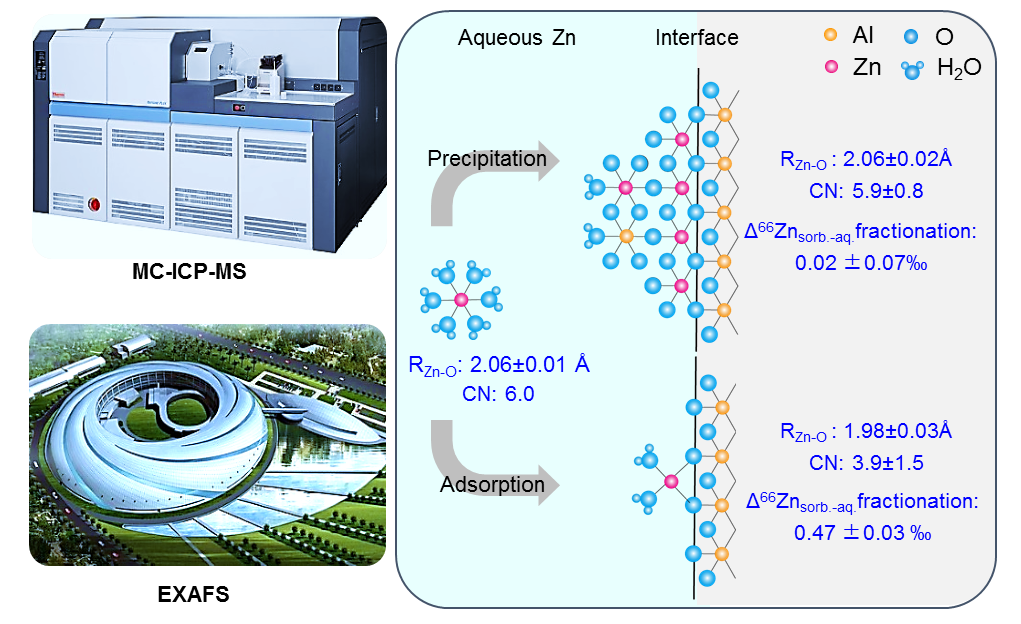 鉴于此,304永利集团官网入口李伟教授和李伟强教授合作,结合各自在同步辐射技术与同位素地球化学上的专长,开展了Zn同位素在氧化铝-溶液界面吸附过程中的同位素分馏机制研究。研究团队在304永利集团官网入口建立了高精度Zn同位素分析方法(长期外部误差为0.04‰),分析能力达到了国际一流水平。研究结果表明,不同吸附密度条件下,Zn同位素的吸附分馏程度差异较大。低吸附密度(Г≤0.75μmol/m2)条件下,重的Zn同位素优先被氧化铝表面吸附,Δ66Znsorbed-aqueous=0.47±0.03‰;高吸附密度(Г≥1.59μmol/m2)条件下,吸附相和残余溶液相几乎不发生Zn同位素的分馏(Δ66Znsorbed-aqueous=0.02±0.07‰)。为了从分子水平揭示上述Zn同位素吸附分馏差异的机制,研究团队依托国家大科学装置开展了基于同步辐射的扩展X射线吸收精细结构光谱技术(EXAFS)研究,从分子水平解析了Zn在不同地球化学条件下的吸附结构(配位构型与化学键长)。EXAFS是一种原子团