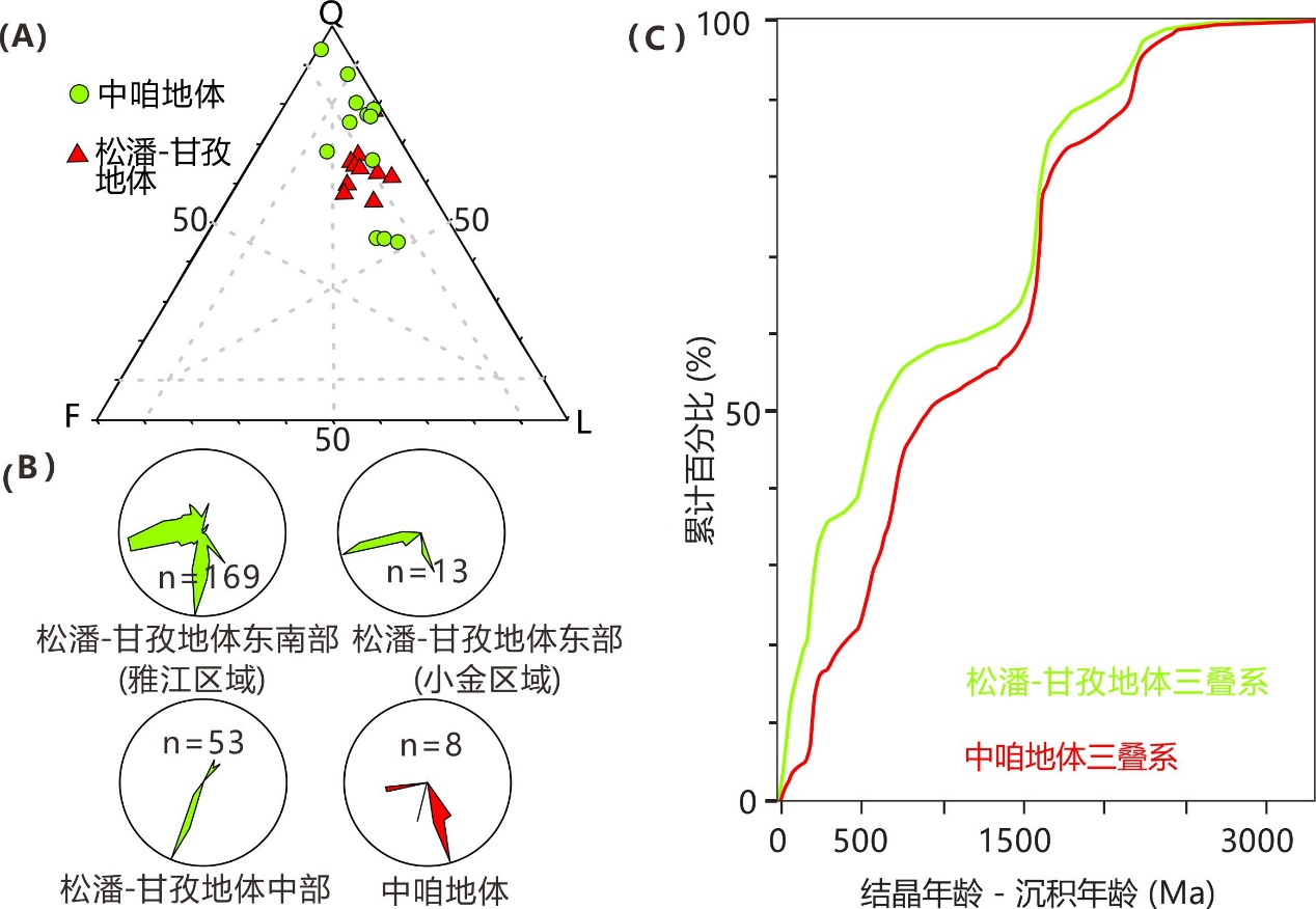 图4 中咱和松潘-甘孜地体三叠系浊积岩对比:QFL(石英-长石-岩屑)三角图解(A);古水流(B);碎屑锆石年龄累积曲线图(C)