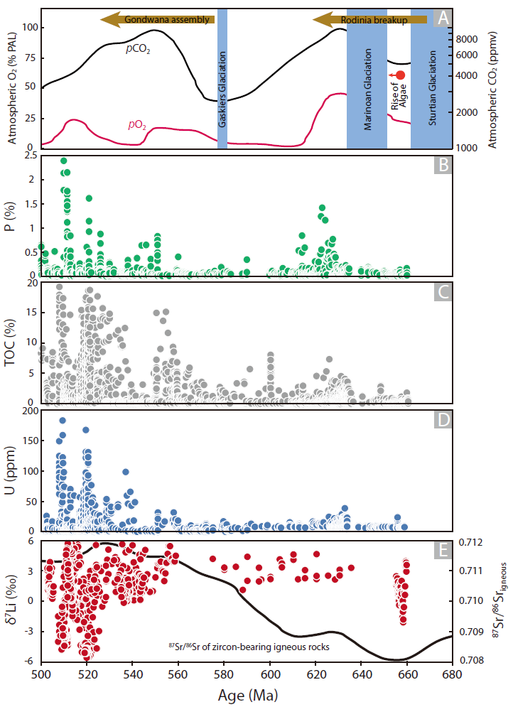 图1. 新元古代末期到寒武纪中期 (ca. 660-500 Ma) 海相沉积泥岩Li同位素和K/Al变化