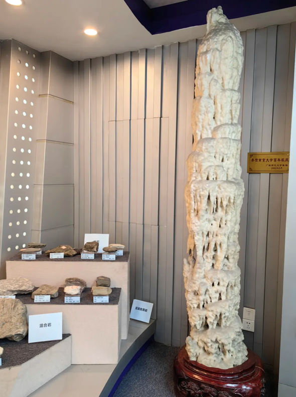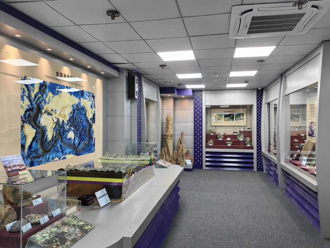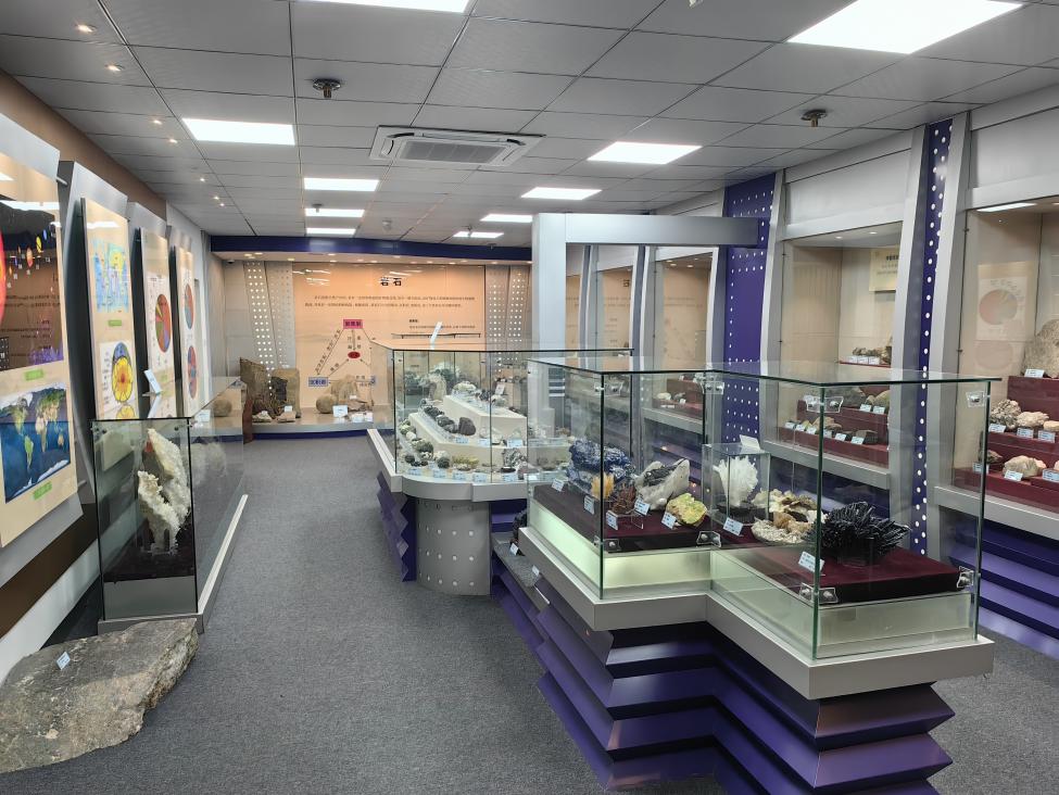 由彭兆远先生捐建的矿物晶体展区、三大类岩石展区、矿物展柜(包括天然金刚石、金、银等矿物晶体)以及矿产展柜组成,广西师范大学捐赠的精美绝伦的钟乳石展品(高2.35米)摆放在三大类岩石展区的醒目位置,辅以太阳系家族与地球、全球板块构造分布、地壳主要矿物含量、地壳和全球主要元素含量以及矿物、岩石、矿产等展板介绍。