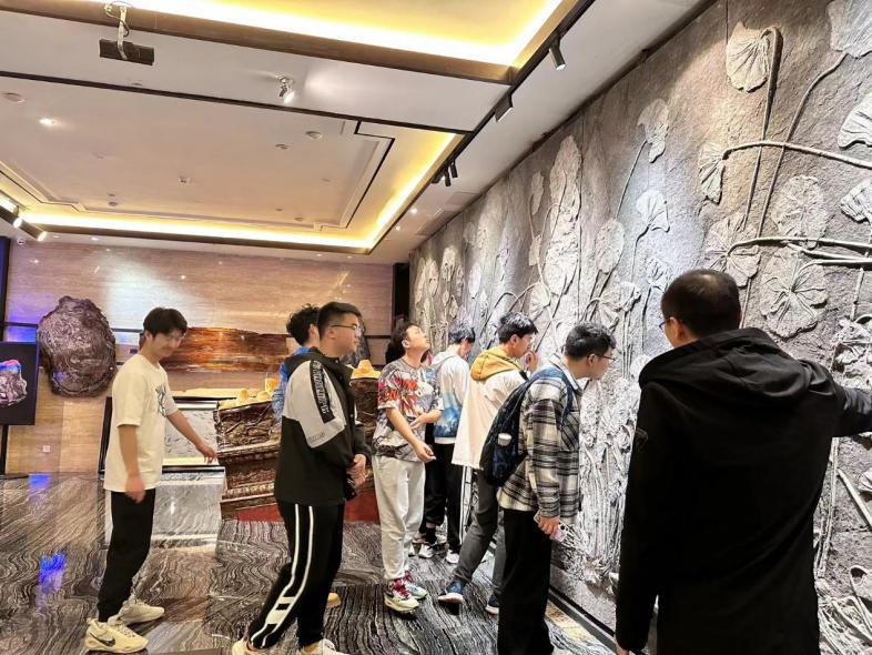 为确保每位同学都能近距离观察到奇珍异宝,领略大自然的鬼斧神工,同学们分为两队,分别由朱郗和孙国梁两位老师带队讲解。一进入大厅,印入眼帘的是一个巨大的紫水晶晶洞,后面是满墙铺陈的海百合。继续深入大厅内部,里面陈列着异彩纷呈、千奇百怪的矿物,有千姿百态的黄铁矿,色彩缤纷的水晶,“毛茸茸”的石膏等多种多样的矿物展品,一下子吸引了同学们的目光。