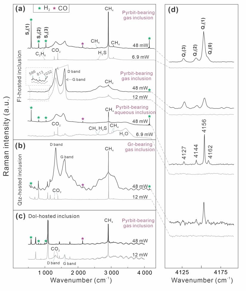 上述结果表明,在应用拉曼光谱分析表征包裹体组成时,应严格控制激光功率,或避免激光聚焦在碳质组分表面,以降低人工产氢干扰的风险,从而更为准确地揭示地球深部T-P-x-f(O2)性质及其演化。该反应可在尺寸较小的反应腔内进行,对反应温度要求低;加之石墨、沥青等材料价格相对低廉,因而该成果从地质研究的角度为工业制氢提供了一定的参考。