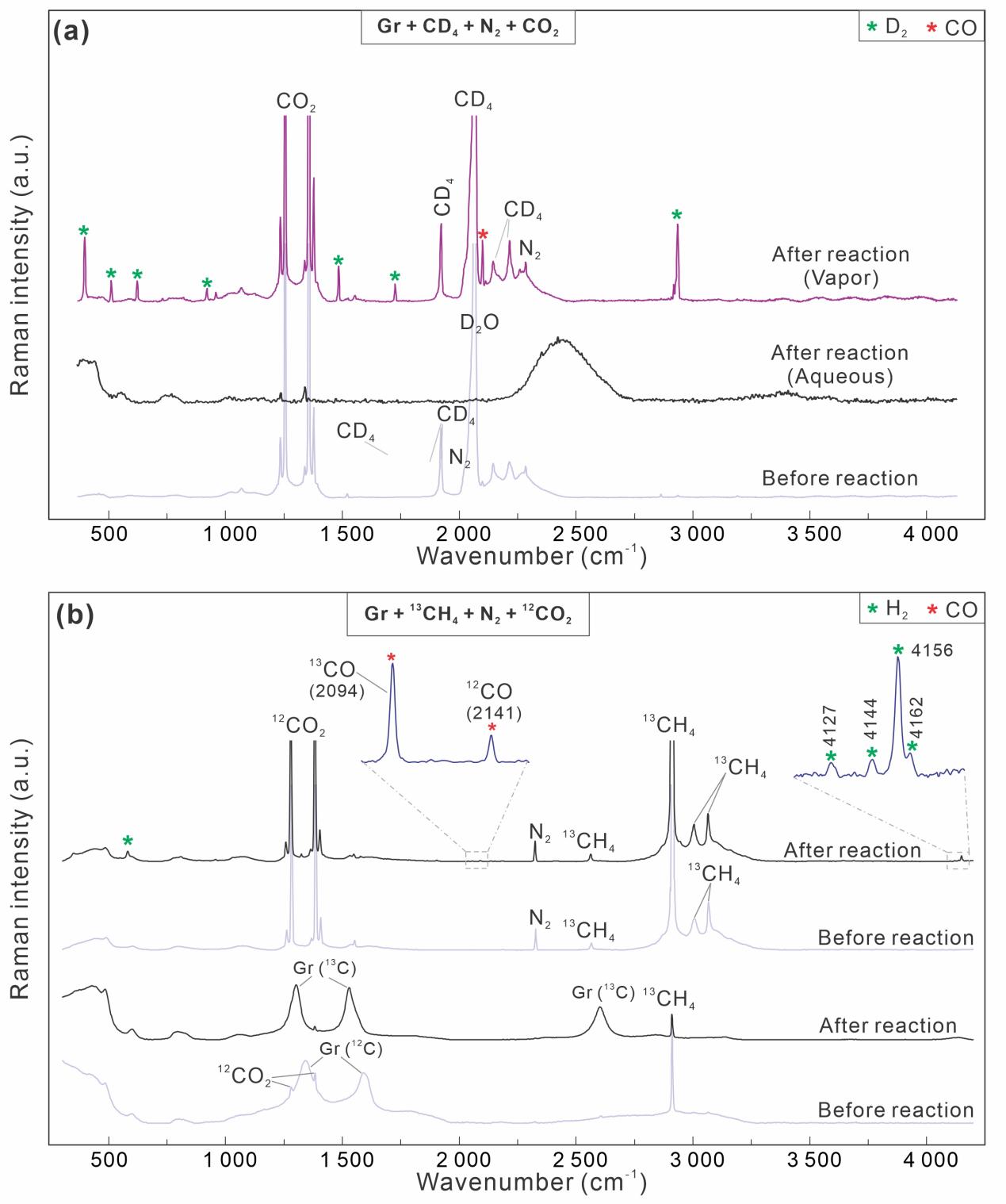 当前,拉曼光谱分析技术是鉴定单个包裹体中氢气最有效的手段。王小林教授团队对石英、白云石、萤石等矿物中的自然包裹体和合成包裹体(熔融石英毛细管胶囊)开展了系统的原位拉曼光谱分析(图1),发现在激光照射下,石墨、焦沥青、金刚石等碳质组分可以催化甲烷分解,在数秒至数十秒内即可累积被拉曼光谱分析检测到的氢气(图2)。若体系中含有CO2,还可检测到CO的生成。若用CD4代替甲烷,生成的是D2而非H2,这进一步明确了氢气源自甲烷分解(图3)。对于含13CH4体系,可以检测到13C-石墨的生成,表明甲烷分解的最终产物是石墨。这些新生成的碳可与12CO2反应形成13CO和12CO(图3)。只有当激光达到一定功率(如532 nm激光为13.9 mW)时,才能在正常实验时间内检测到明显的氢气信号,而激光波长对产氢影响不显著(473 nm,532 nm,633 nm)。综合以上实验现象,团队提出了甲烷在碳质材料表面被激光诱导分解产氢的反应模型(图4)。考虑到含CO2体系中氢气信号更强,该团队认为甲烷分解产生的碳覆盖在反应位点上,阻止产氢持续;而CO2通过与碳反应形成CO再活化反应位点,可维持产氢反应进行(图4)。