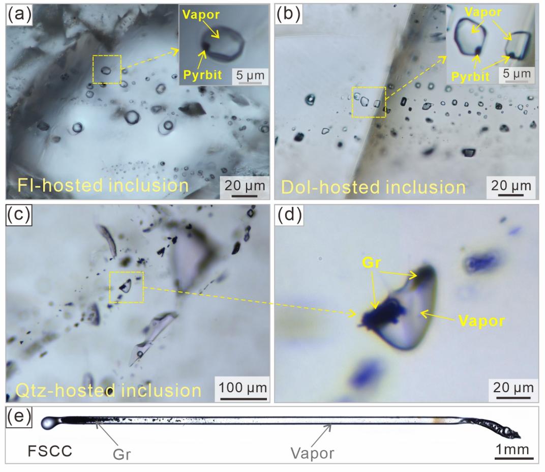 图1萤石(Fl)、白云石(Dol)和石英(Qtz)中含碳质材料与甲烷的天然包裹体与含气体和碳质材料的熔融石英毛细管胶囊(FSCC)
