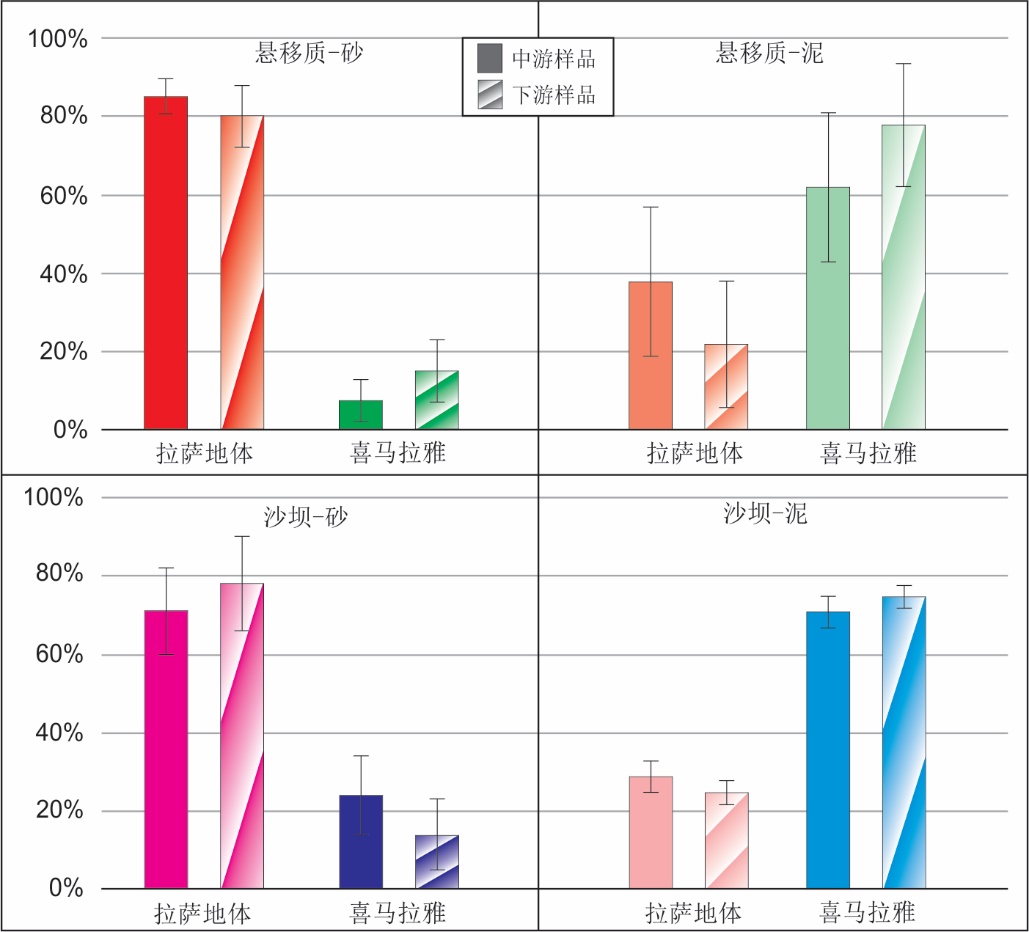 研究结果显示,无论是悬移质还是河漫滩沉积物,砂质颗粒绝大部分都来自拉萨地体,而泥质碎屑主要来自喜马拉雅造山带。根据定量化的物源分析结果显示,在河漫滩中,拉萨地体的碎屑物质供应是喜马拉雅的两倍,而在悬移质中,喜马拉雅的物质贡献是拉萨地体的1.4倍。综合考虑河流携带的沉积物,右岸喜马拉雅造山带的沉积岩可产生与左岸拉萨地体的花岗岩和火山岩相当的沉积物通量(图3)。