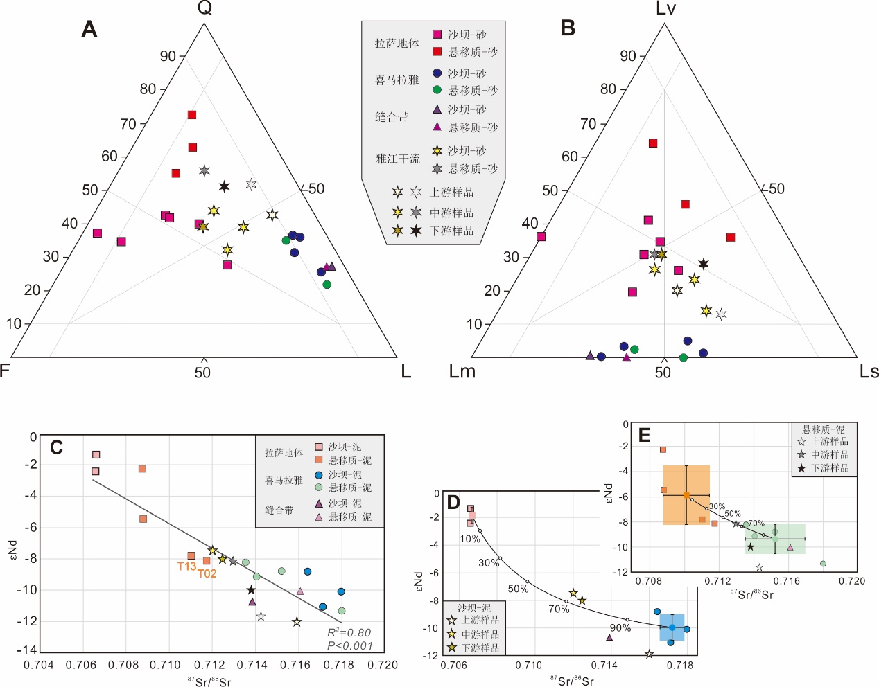 图2 雅鲁藏布江沙坝和悬移质中砂的碎屑组分(A、B)和Sr-Nd同位素特征(C-E)。