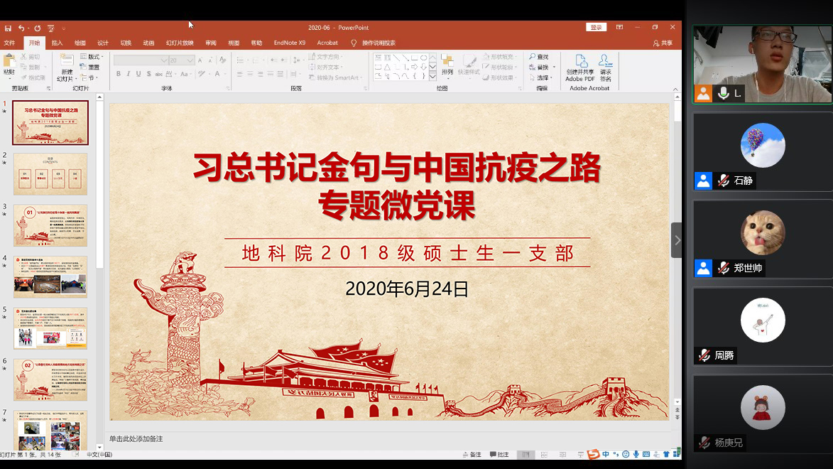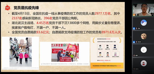 为深入贯彻落实《关于开展基层党组织常态化疫情防控“四个一”行动的工作通知》具体要求,充分发挥党支部战斗堡垒作用和全体党员先锋模范作用,让党旗始终高高飘扬在疫情防控、返校复学、事业发展全过程全方位,2020年6月24日,永利集团官网2018级硕士生一支部举行了一次线上主题党日活动。党支部书记李全坤做了以“习总书记金句与中国抗疫之路”为题的专题微党课。随后的组织生活会以“迎党的生日、讲战疫故事、悟初心使命”为主要内容展开,支部党员积极发言,结合战疫说身边故事,讲切身体会。
