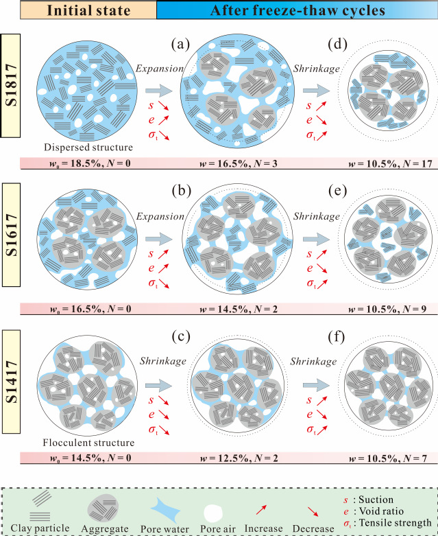 针对上述科学问题,304永利集团官网入口唐朝生教授课题组对具有不同压实含水率及压实干密度的试样进行了多轮开放环境下的冻融循环试验,并先后测试了试样沿干燥路径的抗拉强度、孔隙比及吸力(图2)。研究发现随着冻融循环次数的增加,试样的抗拉强度均呈现先减小后增大的趋势,且转折点通常位于低于初始含水率1.5%-2.0%的位置。这主要归因于试验初期冻融引起的孔隙比增加以及粘聚力和吸力减小等负效应起控制作用,由此导致抗拉强度的减小。而试验后期,随着冻融循环次数的增加和含水率的进一步减小,干燥诱导的土体收缩、粘聚力及吸力增大等积极效应占据主导地位,由此导致抗拉强度的增大。在反复的冻融过程中,初始压实含水率越大的试样表现出更大的膨胀势及收缩势。冻融循环初期,相比干侧压实样,在最优含水率及其湿侧压实的试样受冻胀作用显著,具有更大的孔隙比和更小的吸力及抗拉强度,而在冻融循环后期发生更强烈的收缩,呈现更小的孔隙比和更大的抗拉强度。除此以外,试样的抗拉强度始终随压实干密度的增大而增大,该趋势不受冻融循环及干燥过程的影响。该研究从以团聚体、团聚体间孔隙及水桥为特征的微观结构的角度揭示了冻融循环及干燥过程耦合作用下土体抗拉强度的演化机理(图3)。研究成果对季节性冻土区的基础设施建设具有指导意义,即在最优含水率的干侧和最大干密度下压实土能够显著提升土体的抗冻融性能。