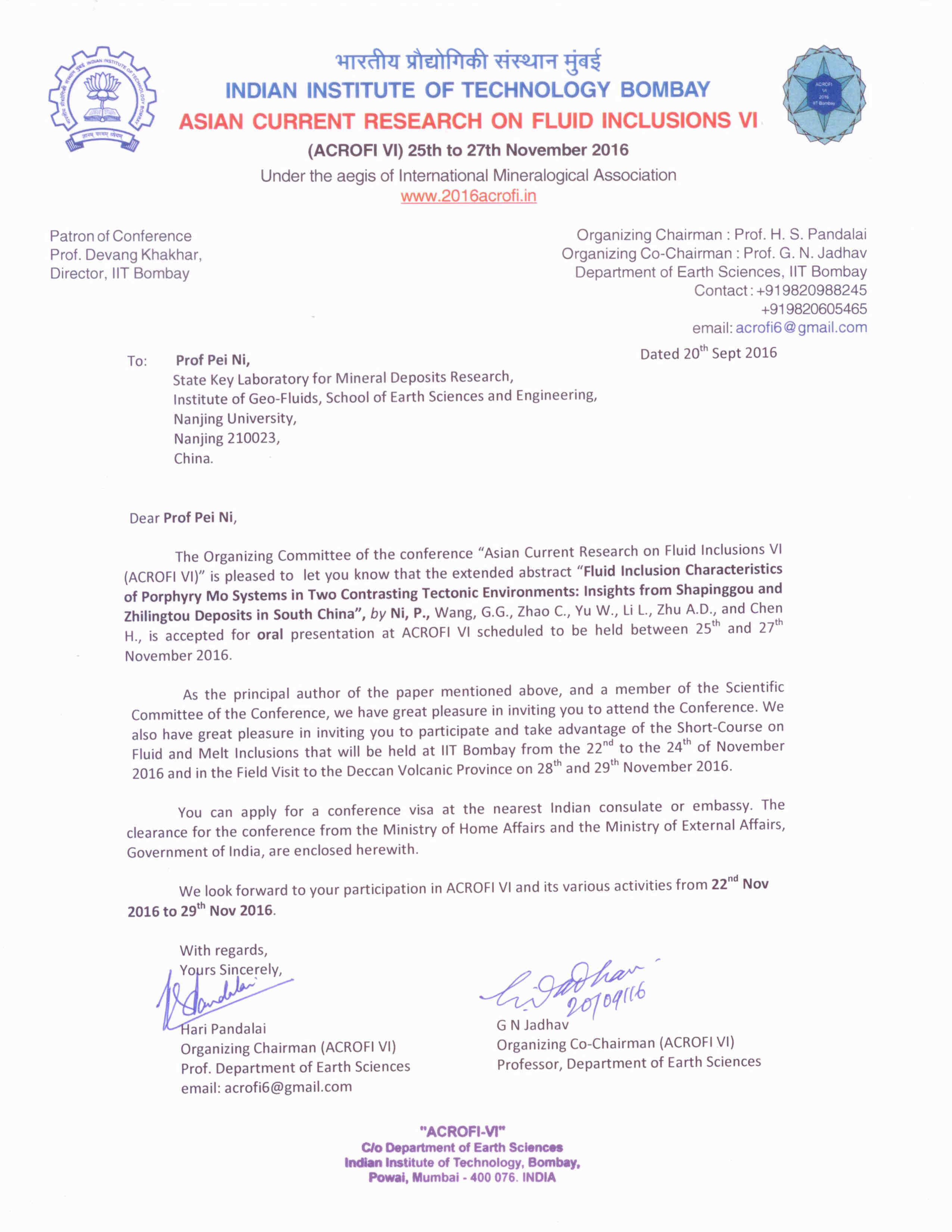 应ACROFI VI会议组委会的邀请,永利集团官网教师倪培拟于2016年11月22日至2016年12月1日赴印度孟买参加ACROFI VI会议并做口头报告。