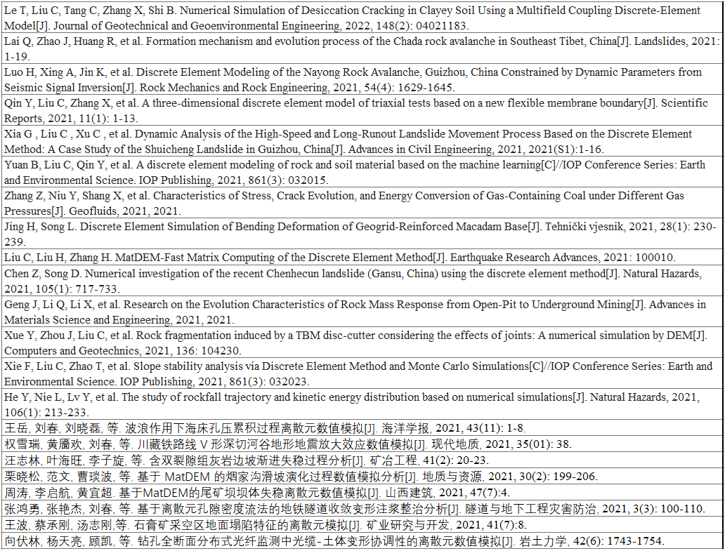 论文多场耦合方法已在课题组的矩阵离散元系统中实现,并公开共享使用,为学术和工业界提供自主原创的数值分析技术支撑。基于这一系统,2021年已有22篇学术论文发表,其中4篇论文发表一区SCI期刊。论文发表单位包括长安大学,成都理工大学,吉林大学,304永利集团官网入口,清华大学,上海交通大学,四川大学,同济大学,中国矿业大学,中国地质大学等。