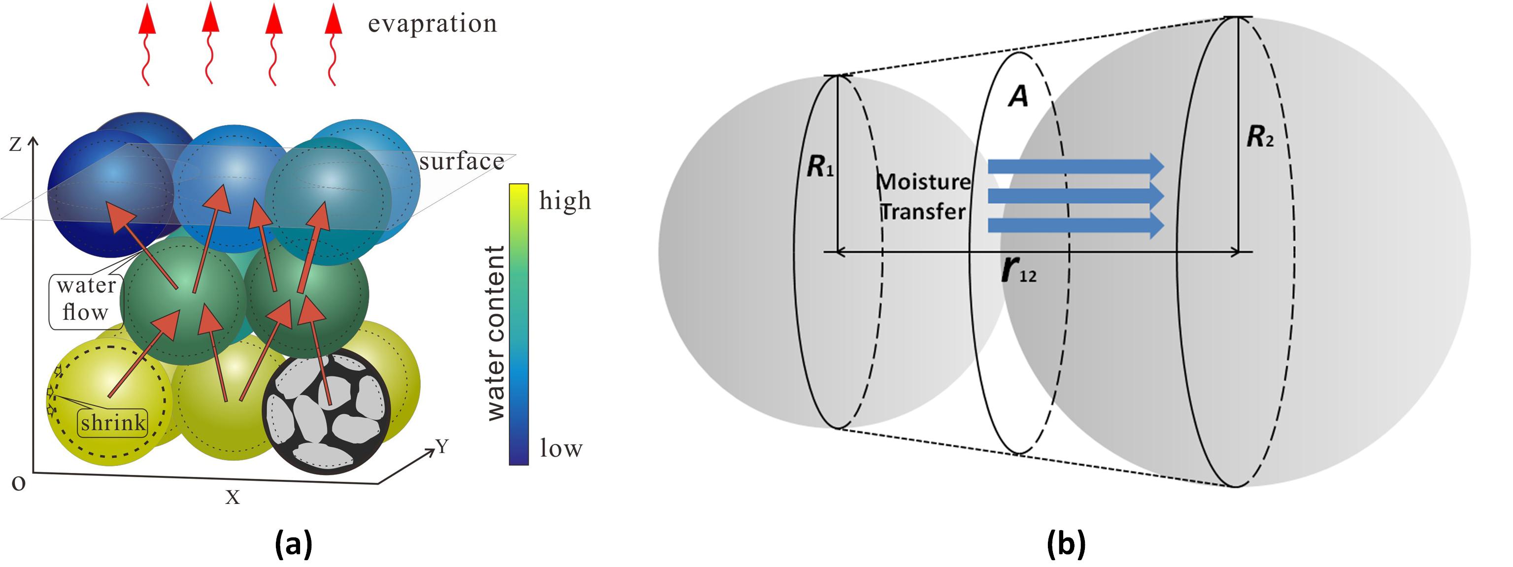 图1(a)土体多场耦合离散元模型和(b)模型内部水分迁移示意图