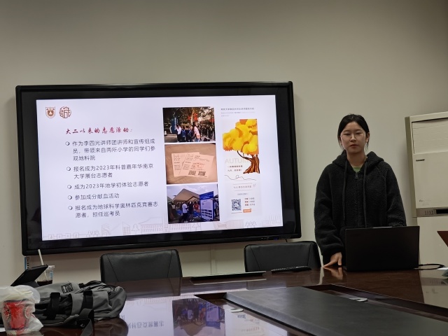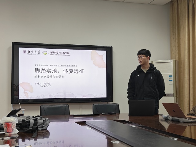 2024 年3 月27 日中午,地科久久爱心奖学金答辩在 A205 会议室举行。会议邀请 99 级校友代表杨涛,地科院学工组毛予倩、陈昕、白若蓉出席会议。学院 12 名本科生参与评选,先后分享自己入学以来,在思想、性格、学业、科研、文体活动、志愿服务等各个方面的成长与进步。