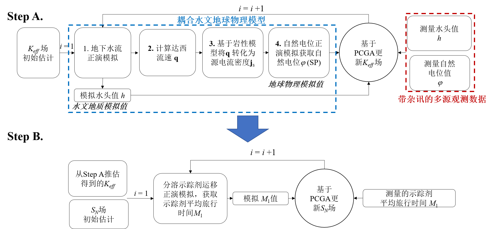 为解决上述问题,永利集团官网吴吉春教授和施小清教授课题组与美国斯坦福大学Peter K. Kitanidis教授合作,构建了一套精细刻画DNAPL污染源区结构的多源数据同化框架。该框架的先进性表现在两方面:1)融合大量廉价且低精度的水文地球物理数据(如self-potential自然电位,SP)与少量高精度的钻孔观测数据(如压力水头,示踪剂浓度),从而以较低的观测成本实现DNAPL场址的高精度刻画。自然电位法是一种无损物探方法,通过布设于地表的电极来监测地下流体造成的电性差异,基于此电性差异可间接获知地下流体的动态与含水层非均质空间结构。由于自然电位法无需布设钻孔,仅通过地表电极便可实现监测,其观测成本大大低于钻孔调查。但限于信号干扰和岩性物理关系,自然电位数据的测量精度通常较低。基于数据融合思路,本次研究联合了大量廉价-低精度的自然电位数据与少量昂贵-高精度的水力层析数据(压力水头),可以较低的成本获得高精度的渗透系数空间分布。基于此高精度渗透系数估计结果,进一步融合分溶示踪剂数据(partitioning tracer),从而实现DNAPL场址的高精度刻画。2)采用主成分地质统计反演方法(Principal Component Geostatistical Approach, PCGA),对协方差矩阵进行低秩估计,从而大大缓解了高维参数反演问题的计算负担。该多源数据同化框架的流程图参见图1。