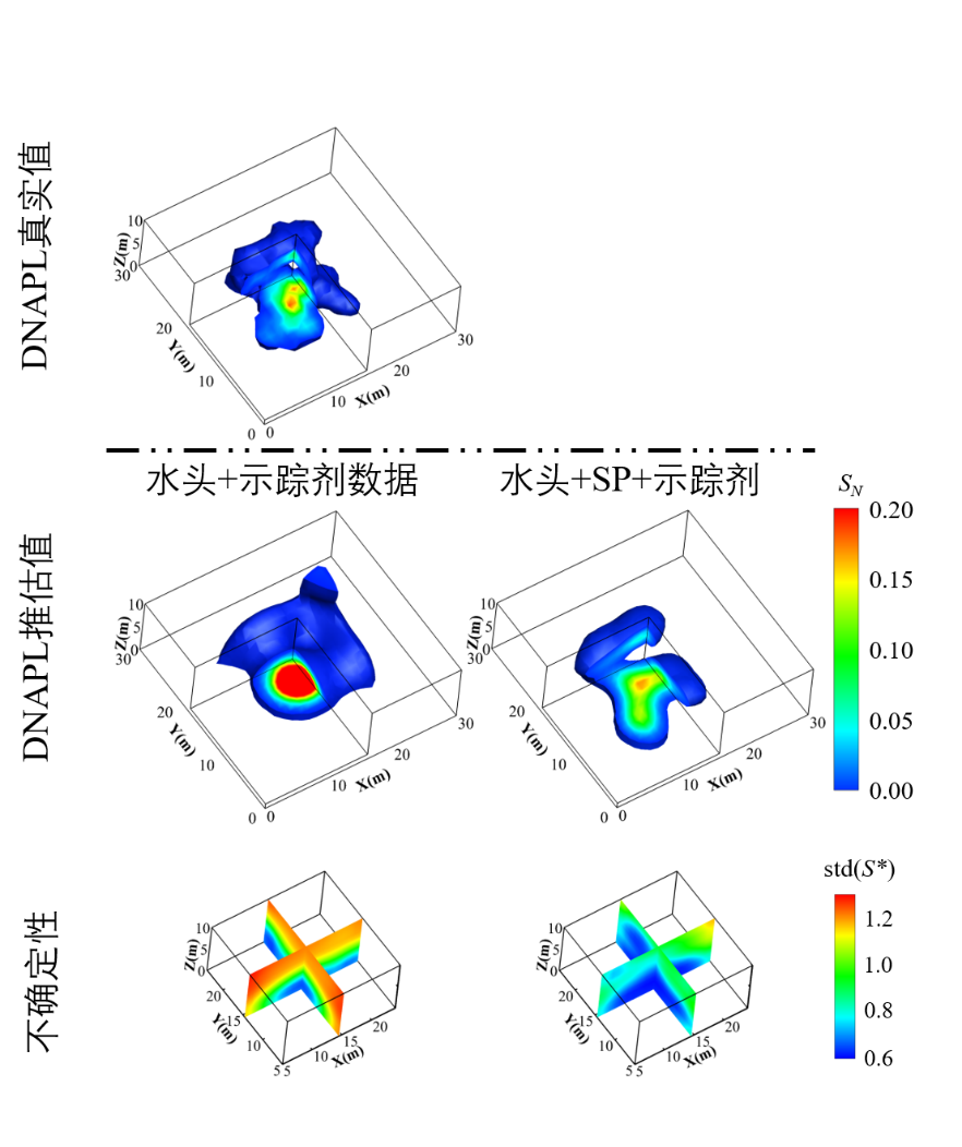 上述研究成果以“Improved characterization of DNAPL source zones via sequential hydrogeophysical inversion of hydraulic-head, self-potential and partitioning-tracer data”2020年7月发表于水文学顶级期刊《Water Resources Research》,博士研究生康学远为第一作者,施小清教授和吴吉春教授为共同通讯作者,304永利集团官网入口为第一署名单位。本研究获得了国家重点研发计划(2018YFC0406402),国家自然科学基金(41730856,41672229)和国家留学基金委的联合资助。